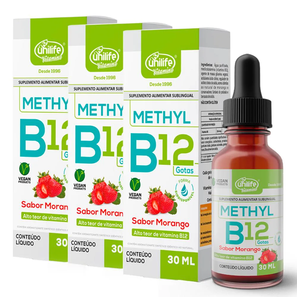 Kit 3 Vitamina B12 Methyl em Gotas Unilife Sabor Morango 30 Ml