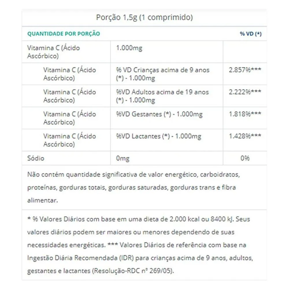 Ácido ascórbico. Agente carreador celulose microcristalina (INS 460i), estabilizante croscarmelose sódica (INS 468), glaceantes: copolímero enxertado de álcool polivinílico e polietilenoglicol (INS 1209), talco (INS 553iii), hidroxipropilcelulose (INS 463), polivinil álcool (INS 1203), antiaglutinantes: estearato de magnésio (INS 470iii), dióxido de silício (INS 551), corantes: dióxido de titânio (INS 171) e laca de alumínio com amarelo crepúsculo (INS 110) e emulsificante mono e diglicerídeos de ácidos graxos (INS 471). NÃO CONTÉM GLÚTEN. Recomendações de Uso