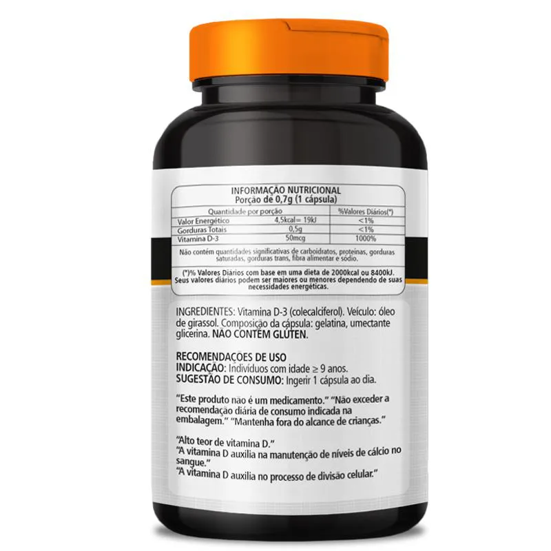 INGREDIENTES: Vitamina D3 (colecalciferol). Veículo: óleo de girassol. Composição da cápsula: gelatina, umectante glicerina. NÃO CONTÉM GLÚTEN. RECOMENDAÇÕES DE USO INDICAÇÃO: Indivíduos com idade ≥ 19 anos. SUGESTÃO DE CONSUMO: Ingerir 1 cápsula ao dia. ESTE PRODUTO NÃO É UM MEDICAMENTO. NÃO EXCEDER A RECOMENDAÇÃO DIÁRIA DE CONSUMO INDICADA NA EMBALAGEM. MANTENHA FORA DO ALCANCE DE CRIANÇAS.