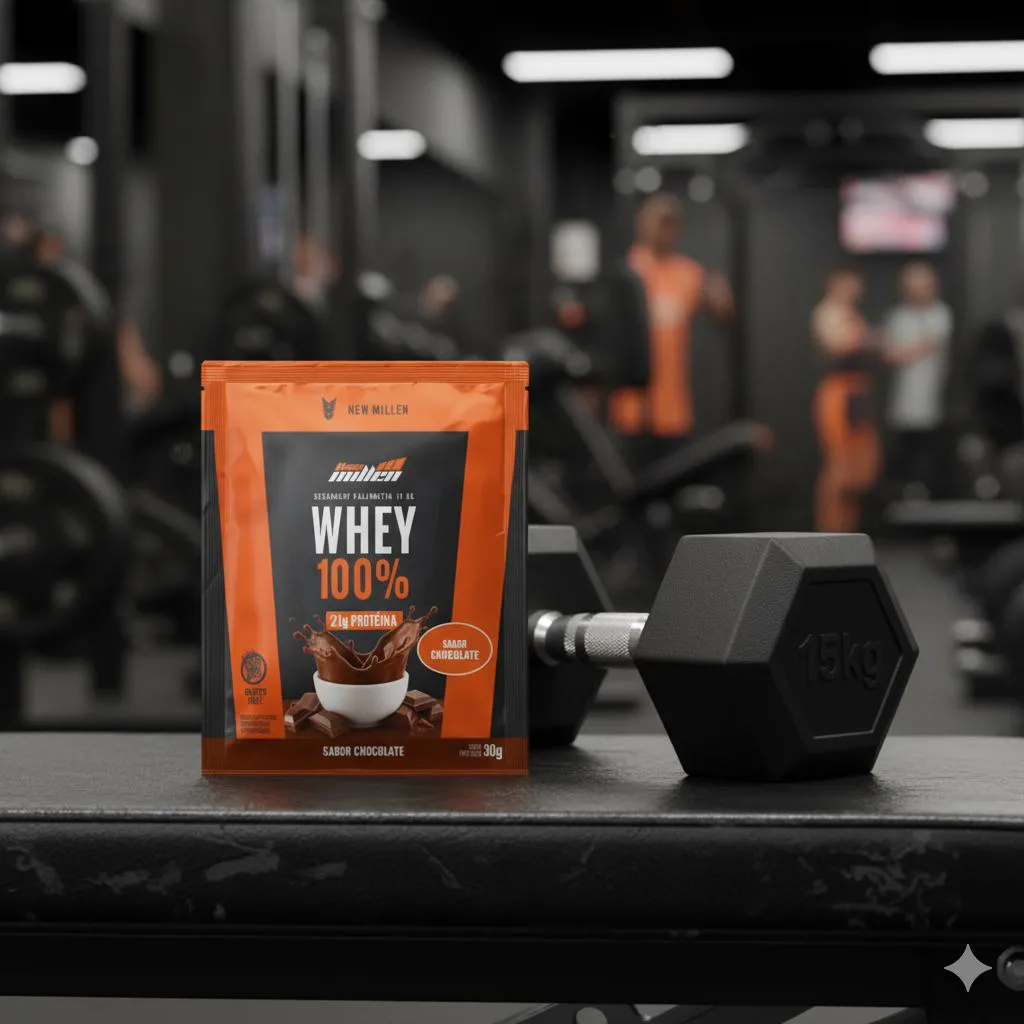O Whey 100% em sachê de 30g da New Millen é um suplemento proteico desenvolvido para fornecer