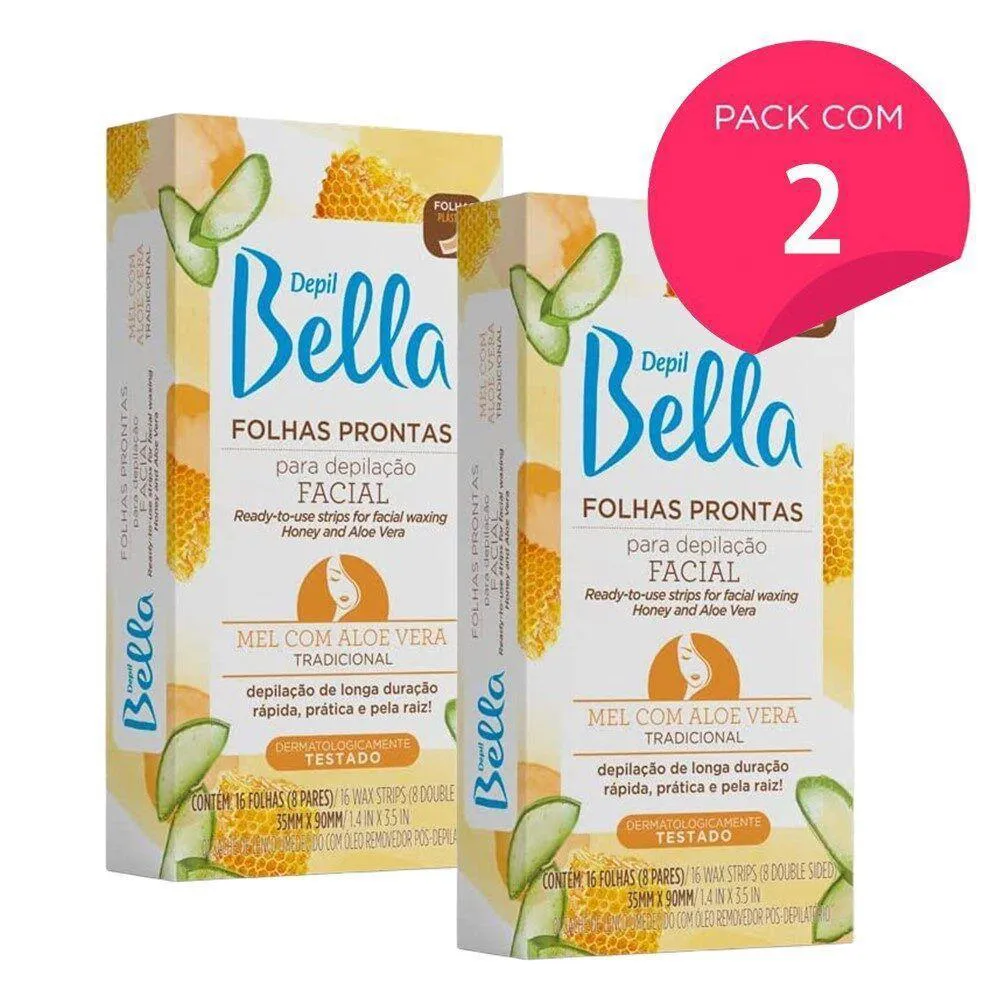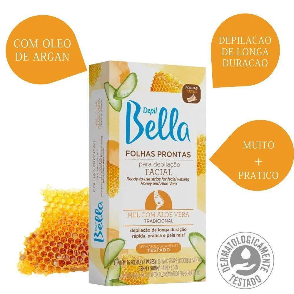 Kit 32 Folhas Prontas para Depilação Facial Mel e Aloe Vera Depil Bella 2Cx 16Un