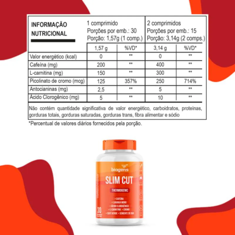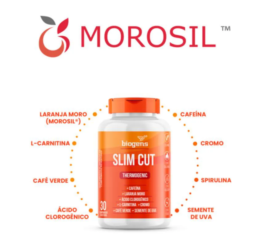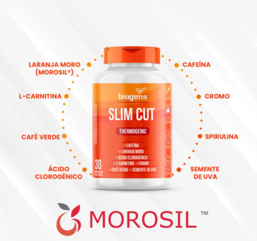 SLIM CUT TERMOGÊNICO 30 COMPRIMIDOS Morosil® é um extrato patenteado obtido a partir do suco das laranjas vermelhas Moro (Citrus sinensis (L.) Osbeck). Essa variedade de laranja é cultivada principalmente na área em torno do vulcão na Sicília, Itália. As laranjas Moro apresentam uma coloração vermelha intensa devido à presença de antocianinas, um tipo de flavonoide com propriedades antioxidantes. INGREDIENTES: Extrato de Laranja Moro (MOROSIL®), Extrato de Café Verde em pó, Cafeína Anidra, L-Carnitina, Extrato de Semente de Uva, Spirulina, Chlorella, Picolinato de Cromo. Estabilizante (Fosfato de Dicálcio – INS 341ii), Estabilizante (celulose microcristalina – INS 460i), Estabilizante (Polivinilpirrolidona- INS 1202), antiumectante (dióxido de silício – INS 551), lubrificante (estearato de magnésio - INS 470i) e Revestimento: Veículos (Álcool Etílico, Água Purificada e Polietilenoglicol). Estabilizante (Hidroxipropil- metilcelulose-INS 464) e Corantes (opacificante INS 171, Corante Vermelho 40 – INS 129). NÃO CONTÉM GLÚTEN SUGESTÃO DE USO: Adultos ≥ 19 anos, ingerir 1 (um) ou 2 (dois) comprimido(s) 30 minutos antes da principal refeição. ou conforme a orientação de médico ou nutricionista. CUIDADOS DE CONSERVAÇÃO: Conservar este produto bem fechado, em lugar fresco, seco e ao abrigo da luz. Após aberto consumir em até 30 dias.