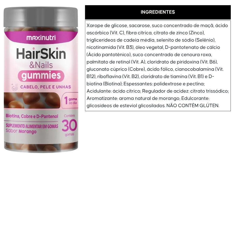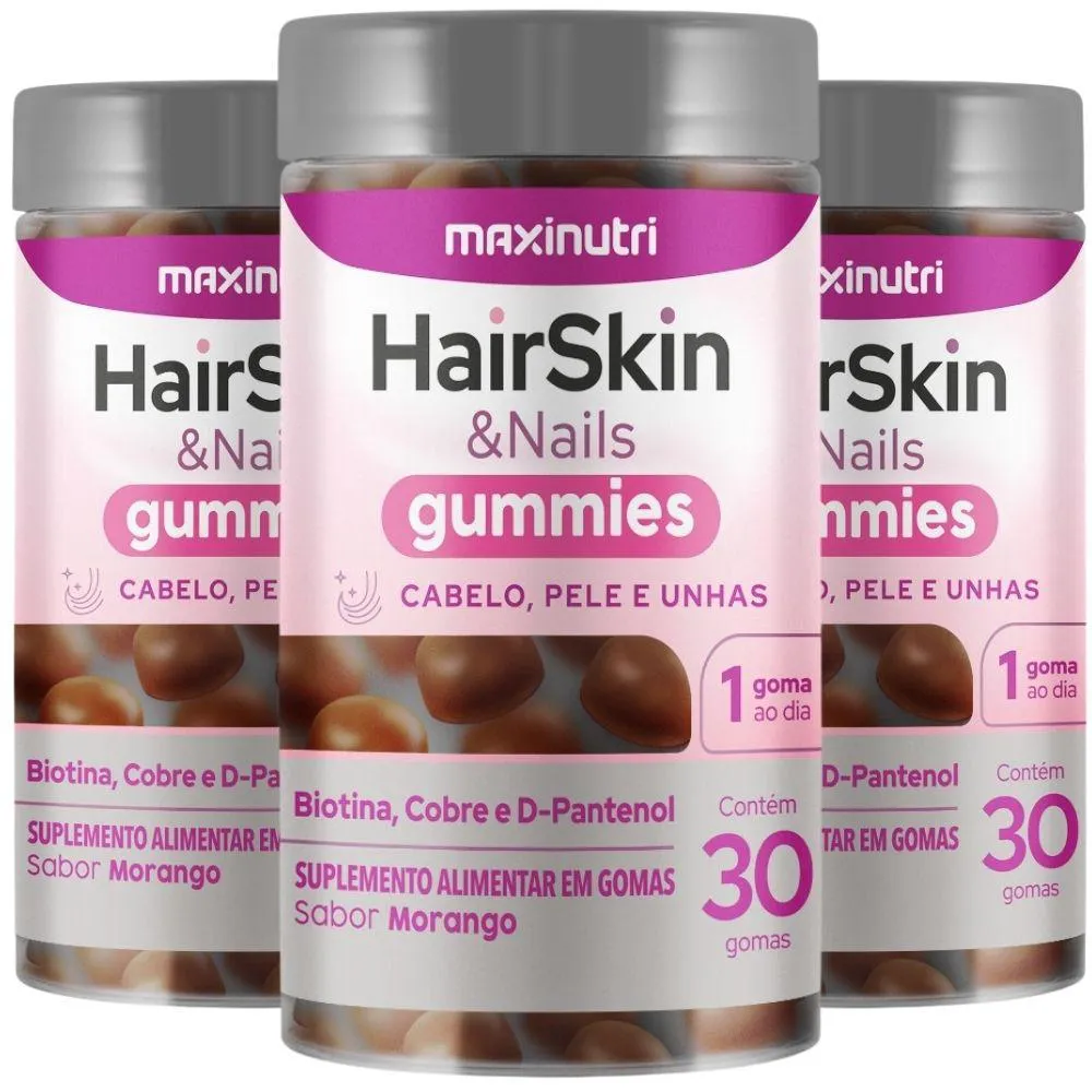 KIT com 3 unidades de HairSkin e Nails Gummies da marca Maxinutri com 30 gomas cada.