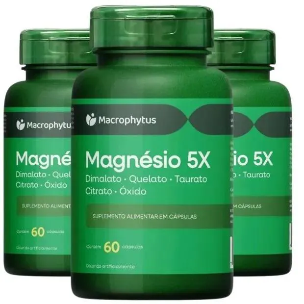 Kit com 3 unidades de Magnésio 5x (Dimalato, Quelato, Taurato, Citrato e Óxido) da marca Macrophytus com 60 Cápsulas cada.