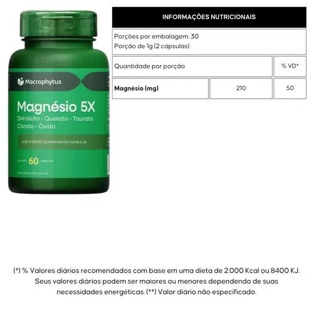 Kit 3x Magnésio 5x ( Dimalato, Quelato, Taurato, Citrato e Óxido) 60 cápsulas - Macrophytus
