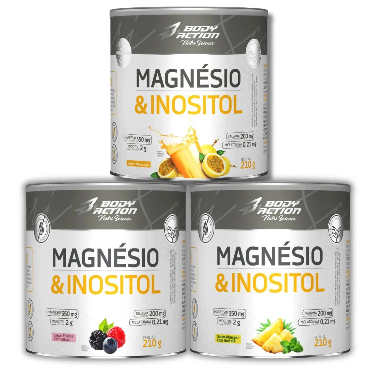 Kit 3x Magnésio e Inositol 210g Body Action – Maracujá + Frutas Vermelhas + Abacaxi com Hortelã