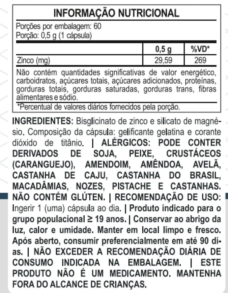 INGREDIENTES: Bisglicinato de zinco e silicato de magnésio. Composição da cápsula: gelificante gelatina e corante dióxido de titânio.