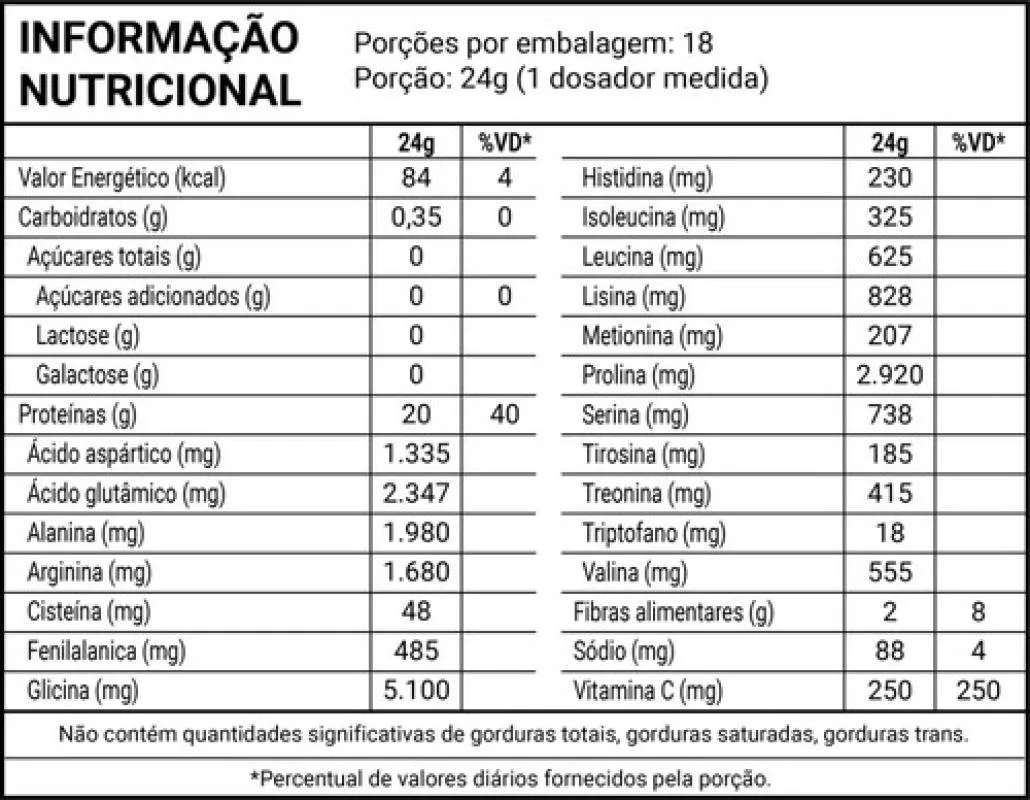 Cada dose oferece cerca de 20 a 22 g de proteína, além de 250 mg de vitamina c para auxiliar na produção de colágeno.