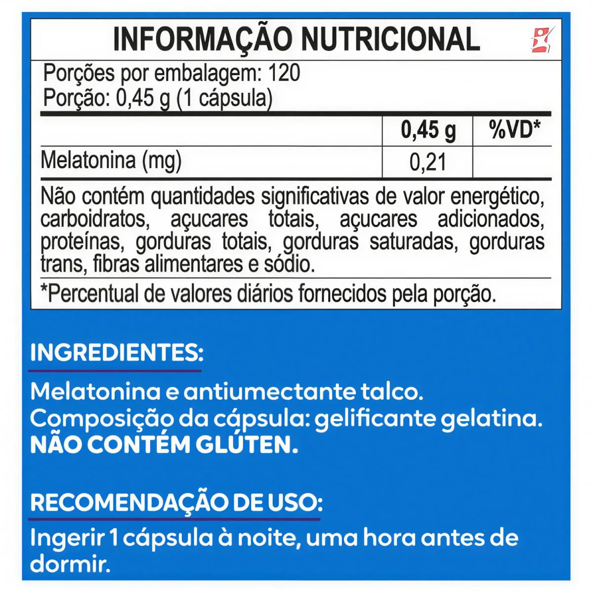 Melatonina em pó e Antiumectante silicato de magnésio. Composição da Cápsula: Gelatina e Água.