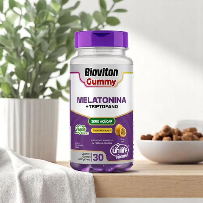 A Melatonina e Triptofano Sabor Maracujá da Unilife é um suplemento alimentar em formato de gomas mastigáveis, desenvolvido para auxiliar na regulação do sono e promover o relaxamento. Combinando melatonina e L-triptofano, este produto oferece uma alternativa prática e saborosa para quem busca melhorar a qualidade do sono. Ingredientes: Água, L-triptofano, melatonina, gardênia azul em pó, acidulante ácido cítrico, aroma natural de maracujá, corante extrato de casca de uva, edulcorante isomalte, gelificante pectina, glaceante cera de carnúba, regulador de acidez di-hidrogenocitrato de sódio.NÃO CONTÉM GLUTEN. LIVRE DE LACTOSE. Recomendação de Uso:
