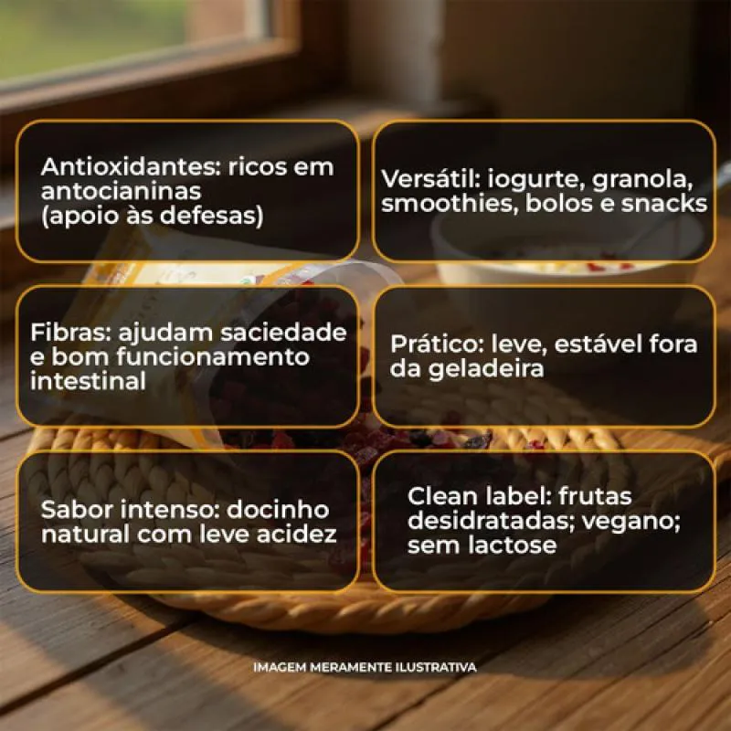 Ingredientes: Goji berry, cranberry, blueberry, cereja glaceada, morango glaceado, cereja glaceada, óleo de girassol, ácido cítrico, açúcar e dióxido de enxofre.