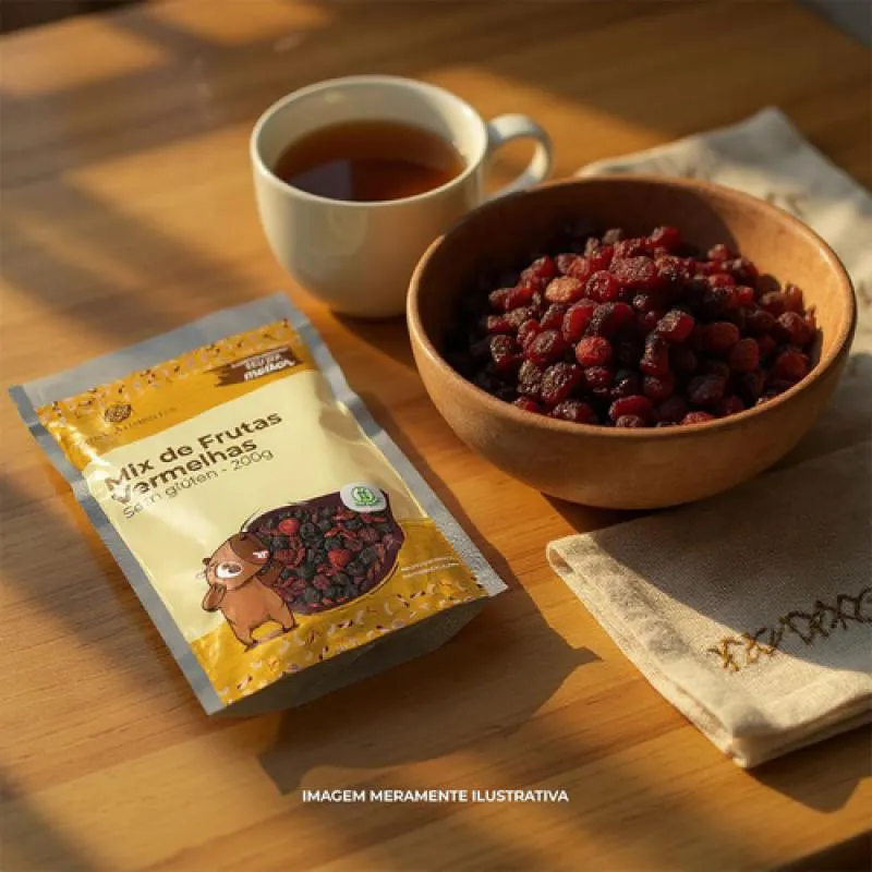 Mix variado de frutas vermelhas (goji, cranberry, blueberry, cereja e morango) para sabor e nutrição.
