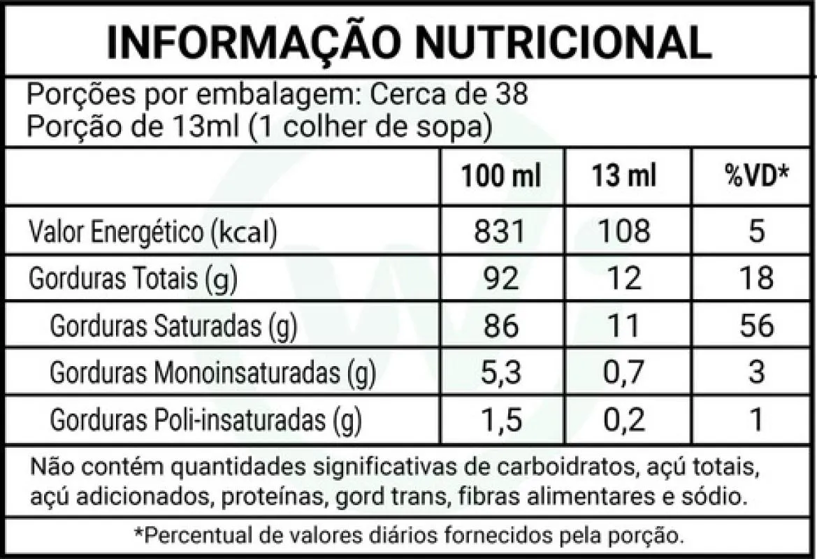 Ingrediente principal: Óleo de coco (Cocos nucifera L), extravirgem Sem adição de químicos, conservantes ou solventes Livre de glúten Características adicionais: coloração naturalmente amarelada, sabor e aroma discretos