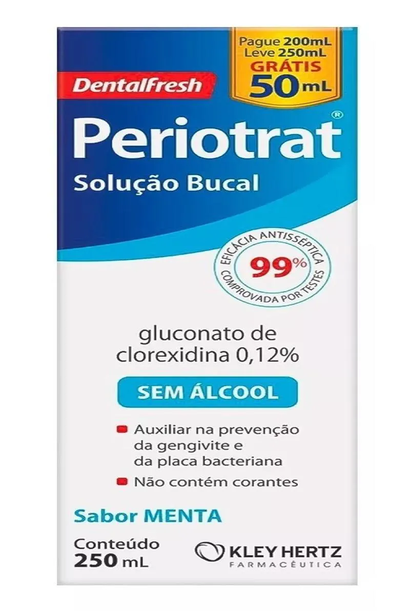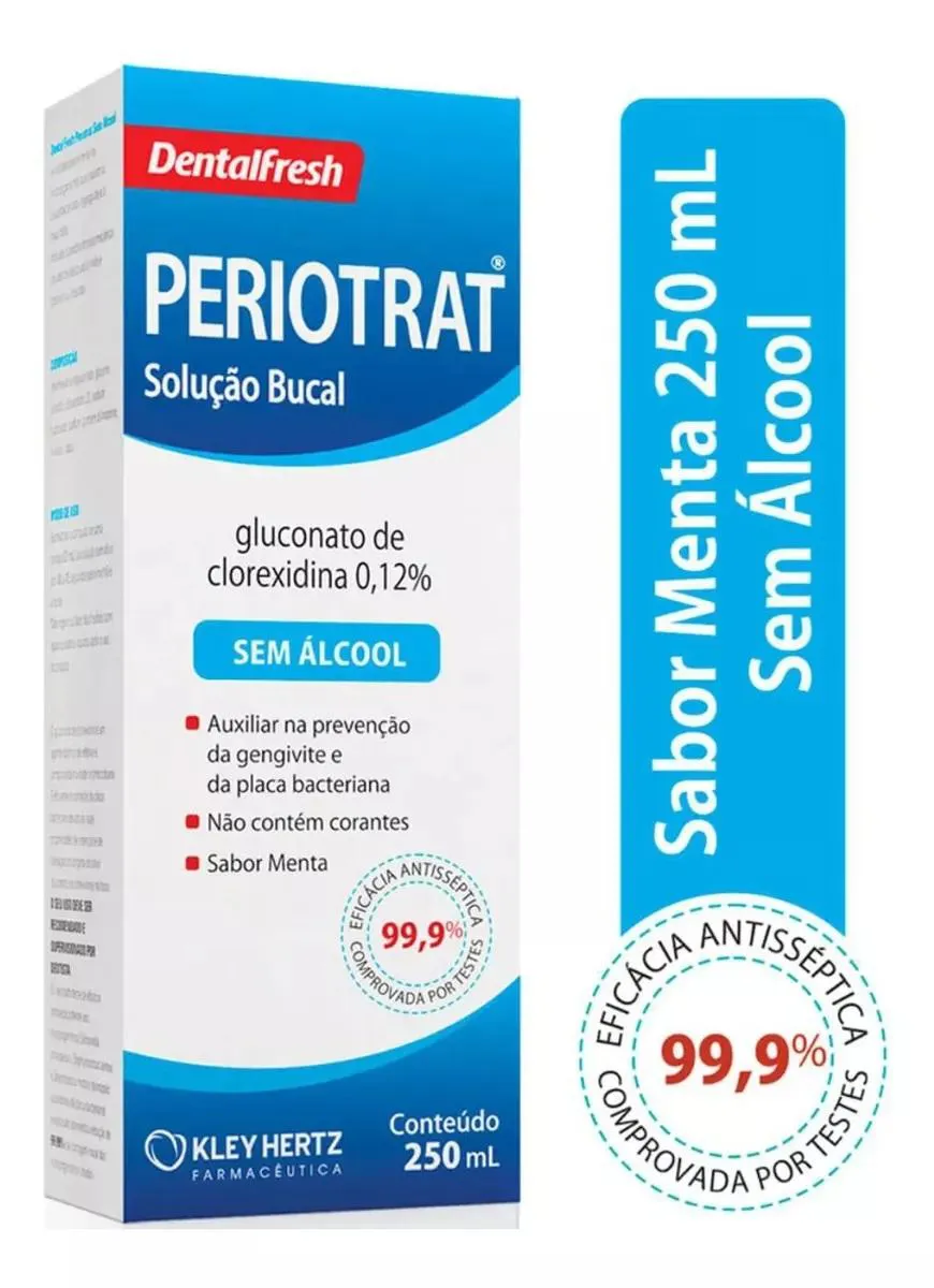 O gluconato de clorexidina 0,12% presente no Periotrat é um agente químico de efetiva e comprovada atividade antimicrobiana. É eficiente no controle da placa bacteriana devido às suas propriedades de retenção e de liberação prolongada do ativo na boca. Também indicada para eliminar o mau hálito, trazer refrescância para a boca e prevenir a formação do tártaro.