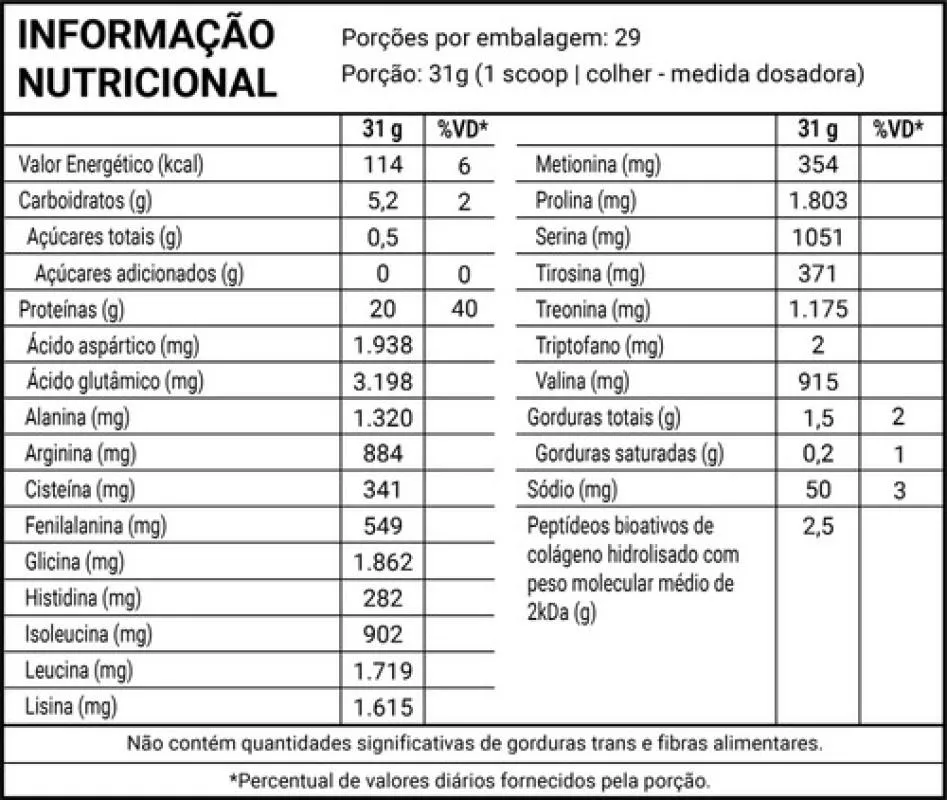 Ingredientes ativos incluem: proteína de soro do leite concentrada, proteína de soro do leite isolada, colágeno hidrolisado (VERISOL®)Outros componentes: beterraba em pó (para coloração), aromatizantes, acidulante (ácido cítrico), espessante (goma xantana), antiumectante (dióxido de silício), edulcorantes (glicosídeos de esteviol e taumatina)