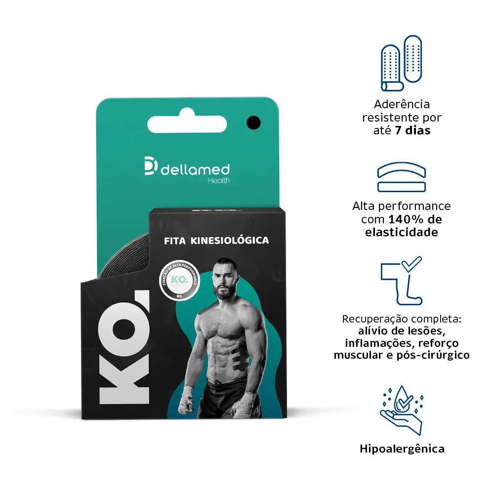 A Bandagem Elástica Adesiva Kinesiológica Dellamed é uma bandagem terapêutica que oferece estímulos sensoriais e mecânicos após aplicada na área do corpo. É indicada para estabilização de articulações e prática de atividades físicas.