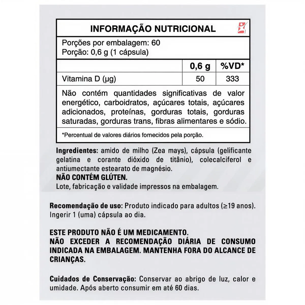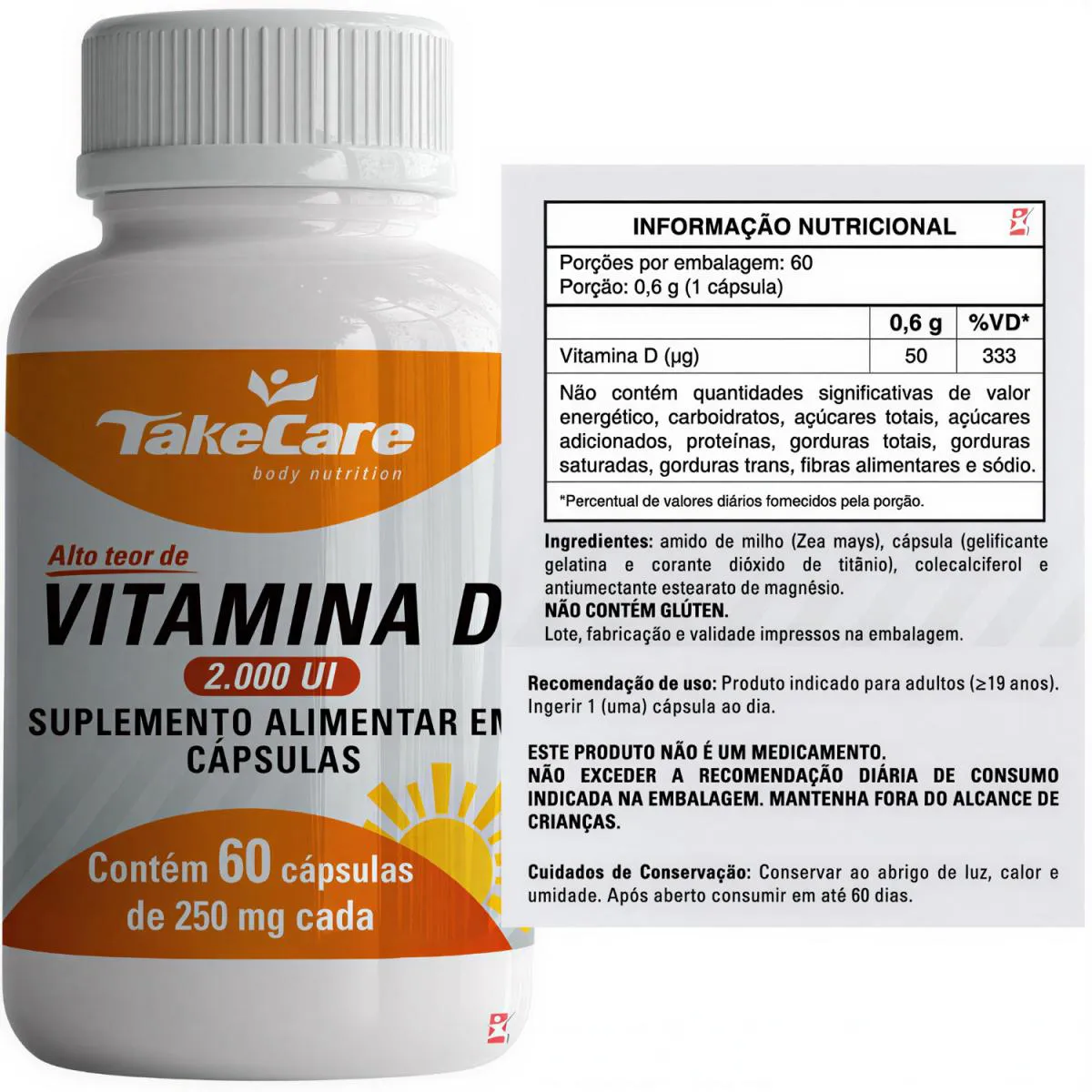 COMBO COM 4 VITAMINA D3 2000UI COLECALCIFEROL COM 60 CÁPSULAS CADA - TOTAL: 240 CÁPSULAS – TAKE CARE _x000D_ _x000D_ — descrição — INDÚSTRIA DO CORPO _x000D_ A vitamina d auxilia na formação de ossos e dentes, na absorção de cálcio e fósforo, no funcionamento do sistema imune, no funcionamento muscular, na manutenção de níveis de cálcio no sangue e no processo de divisão celular. _x000D_ Como todos já conhecem, sabe da importância em nosso corpo. Conhecida também como a vitamina do sol ela faz parte do grupo de micronutrientes, substâncias de extrema importância para as funções biológicas, a vitamina D exerce o papel de fortalecimento do sistema imunológico. _x000D_ E não para por aí não, a Vitamina D3 traz diversos outro benefícios, entre eles no metabolismo dos ossos, ajudando na prevenção de doenças como raquitismo, osteomalácia e osteoporose, no sistema neuromuscular atuando em funções que envolvem desde a síntese proteica até a cinética de contração muscular, e por fim podemos dizer que a deficiência desta vitamina pode ocasionar o acúmulo de gordura corporal. _x000D_ _x000D_ — benefícios — INDÚSTRIA DO CORPO _x000D_ - Sistema Imune; _x000D_ - Auxilia na formação de ossos; _x000D_ - Auxilia na formação de dentes; _x000D_ - Auxilia na absorção de cálcio; _x000D_ - Auxilia na absorção de fósforo; _x000D_ - Auxilia no funcionamento do sistema muscular; _x000D_ - Auxilia na manutenção de níveis de cálcio no sangue; _x000D_ - Auxilia no processo de divisão celular; _x000D_ - Contribui contra a fraqueza muscular; _x000D_ - Aliada na melhora do desempenho cognitivo; _x000D_ - Combate o envelhecimento da pele; _x000D_ - Auxilia na redução de perda de massa óssea. _x000D_ _x000D_ — sugestão de uso — INDÚSTRIA DO CORPO _x000D_ Ingerir 1 (uma) cápsula ao dia. _x000D_ _x000D_ - tabela nutricional - INDÚSTRIA DO CORPO _x000D_ - ANEXO NAS IMAGENS – _x000D_ _x000D_ - composição - INDÚSTRIA DO CORPO _x000D_ - ANEXO NAS IMAGENS – _x000D_ _x000D_ - recomendações - INDÚSTRIA DO CORPO _x000D_ - ANEXO NAS IMAGENS – _x000D_ _x000D_ - dados técnicos - INDÚSTRIA DO CORPO _x000D_ Marca - Take Care. _x000D_ Conteúdo líquido por frasco - 60 Cápsulas. _x000D_ Conteúdo líquido total - 240 Cápsulas. _x000D_ Rendimento por frasco - 60 Doses/Porções. _x000D_ Rendimento total - 240 Doses/Porções. _x000D_ Peso líquido total - 60g. _x000D_ Peso aproximado produto + embalagem - 250g. _x000D_ Código de barras (EAN) - 7898411817576. _x000D_ Registro ANVISA - Dispensado de registro de acordo com a resolução da RDC 27/2010 e RDC 240/2018 da ANVISA. _x000D_ Dimensões do produto - largura: 7,5 cm; altura: 13 cm; comprimento: 7,5 cm. _x000D_ Dimensões da embalagem/pacote - largura: 13 cm; altura: 7 cm; comprimento: 16 cm. _x000D_ _x000D_ - itens do anúncio - INDÚSTRIA DO CORPO _x000D_ - 1 Unidade do produto: COMBO COM 4 VITAMINA D3 2000UI COLECALCIFEROL COM 60 CÁPSULAS CADA – TAKE CARE. _x000D_ Total - 240 Cápsulas POR COMBO.