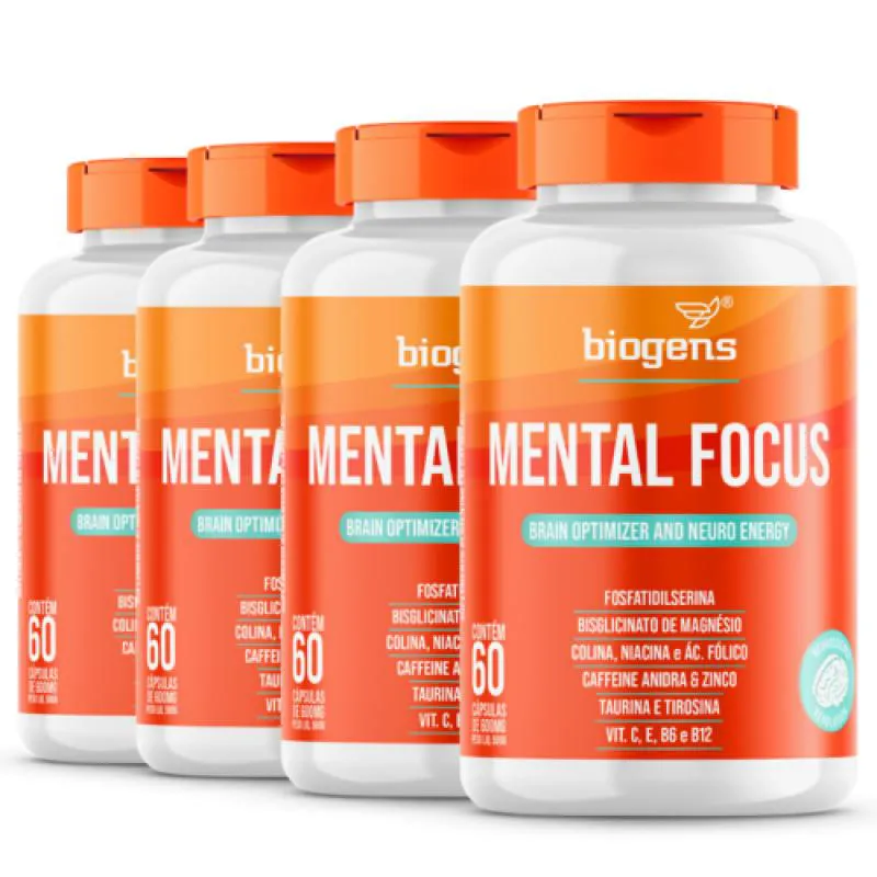 Mental Focus Biogens é um suplemento formulado especialmente com substâncias que, apesar de potencializar o desempenho cognitivo, não são tóxicas ou viciantes. Praticantes de exercício físico possuem suplementos para o upgrade físico bem como praticantes de atividades mentais também podem se favorecer com suplementos para um upgrade mental. Mental Focus Biogens pode ser considerado um nootrópico, já que possui em sua composição nutrientes essenciais e biodisponíveis além de um composto ativo estimulante que colabora para um estado de alerta e atenção. Sua fórmula carrega doses eficientes de fosfatidilserina, cafeína, zinco quelato, colina, taurina, tirosina, ácido fólico, vitaminas C, E e do complexo B. Qual a diferença entre Zinco e Zinco Quelato? Zinco Quelato é formulado para ter uma absorção mais eficaz no organismo. O zinco é um mineral na sua forma livre e o zinco quelato é o zinco na forma elementar que passou por um processo chamado de quelação (processo no qual o mineral é ligado a outra molécula, no caso, a um aminoácido). Esse processo torna o zinco mais biodisponível, tendo, portanto, melhor absorção e eficácia. Colina: é também uma vitamina do complexo B, Vitamina B8, que pode ser produzida pelo organismo, além de ingerida via alimentos ou suplementos. Em nosso corpo, ela é encontrada principalmente nas membranas celulares e no neurotransmissor acetilcolina. Em ambos os casos, a manutenção de níveis adequados é importante para o funcionamento ideal de uma série de processos no organismo. A colina contribui para o metabolismo lipídico e para o metabolismo da homocisteína. Fosfatidilserina: é um composto derivado de um aminoácido que é encontrado em grandes quantidades no cérebro e no tecido neural, já que faz parte da membrana celular. Tirosina: é um aminoácido responsável por diversas funções no organismo e que quando chega no cérebro torna-se precursora de alguns neurotransmissores, como dopamina, noradrenalina e adrenalina, podendo ser considerada, portanto, parte essencial do sistema nervoso. Taurina: é um aminoácido não utilizado para a construção de proteínas. Ela é encontrada no líquido intracelular, além de ser um dos aminoácidos livres mais abundantes nos leucócitos (células que agem na defesa do organismo), cérebro, músculo esquelético, retina e coração. Este aminoácido geralmente é encontrado em bebidas energéticas.