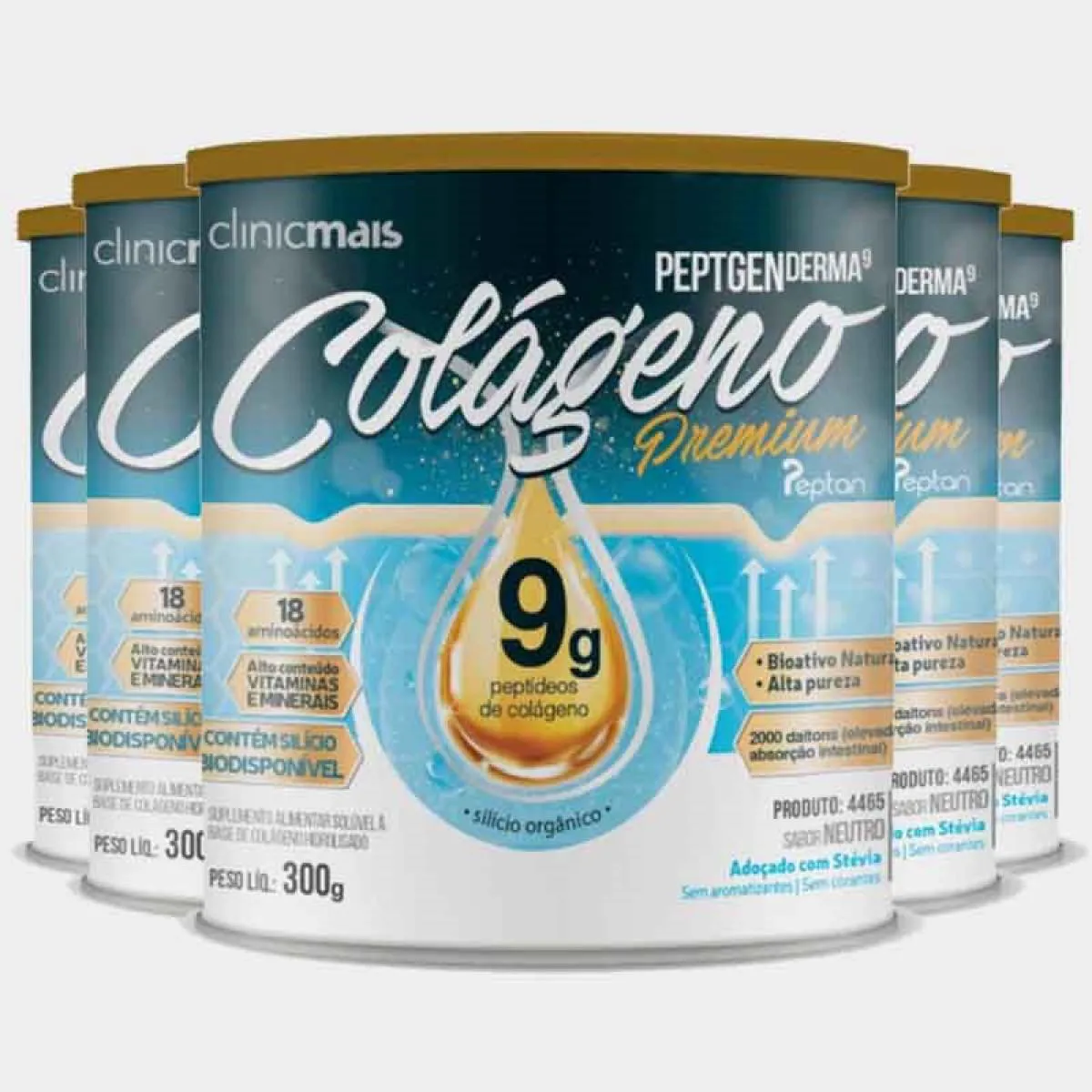 Kit 5 colágeno Hidrolisado Premium 9g Clinic Mais 300g Neutro O colágeno hidrolisado é a proteína mais abundante no corpo e é o componente chave do tecido conjuntivo, cartilaginoso e epitelial, que compreendem tecidos como: a pele, ossos, músculos, cartilagens, tendões e ligamentos. - 9g de peptídeos de colágeno PEPTAN® por porção