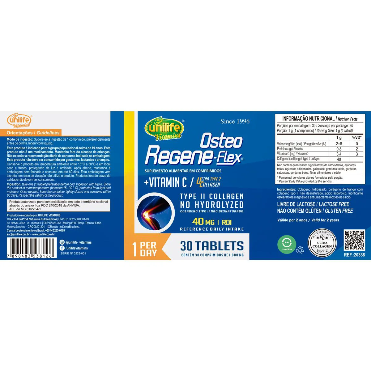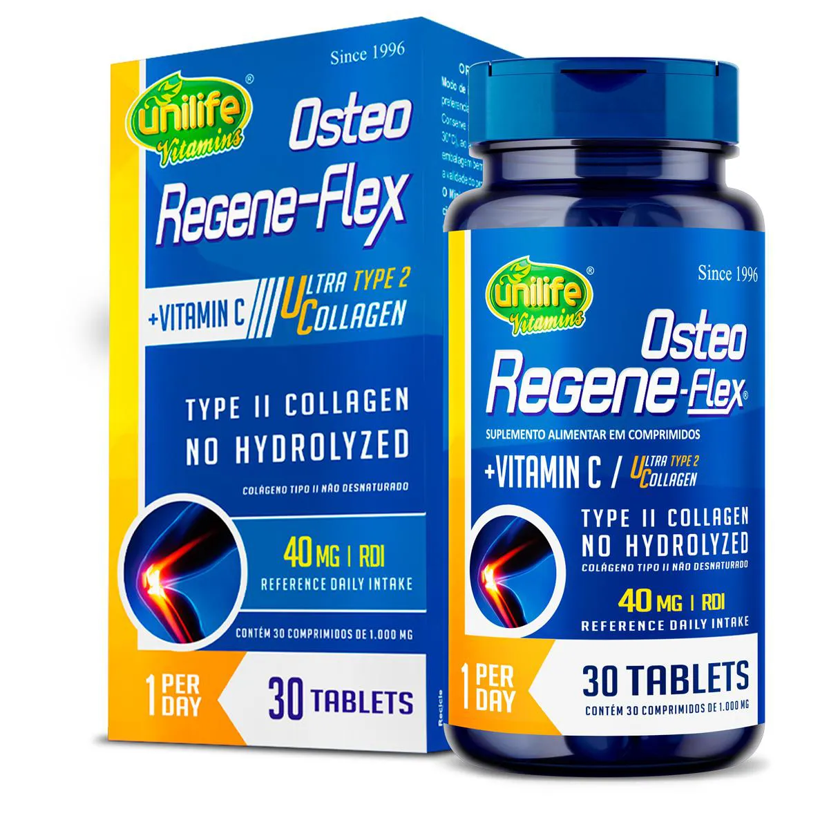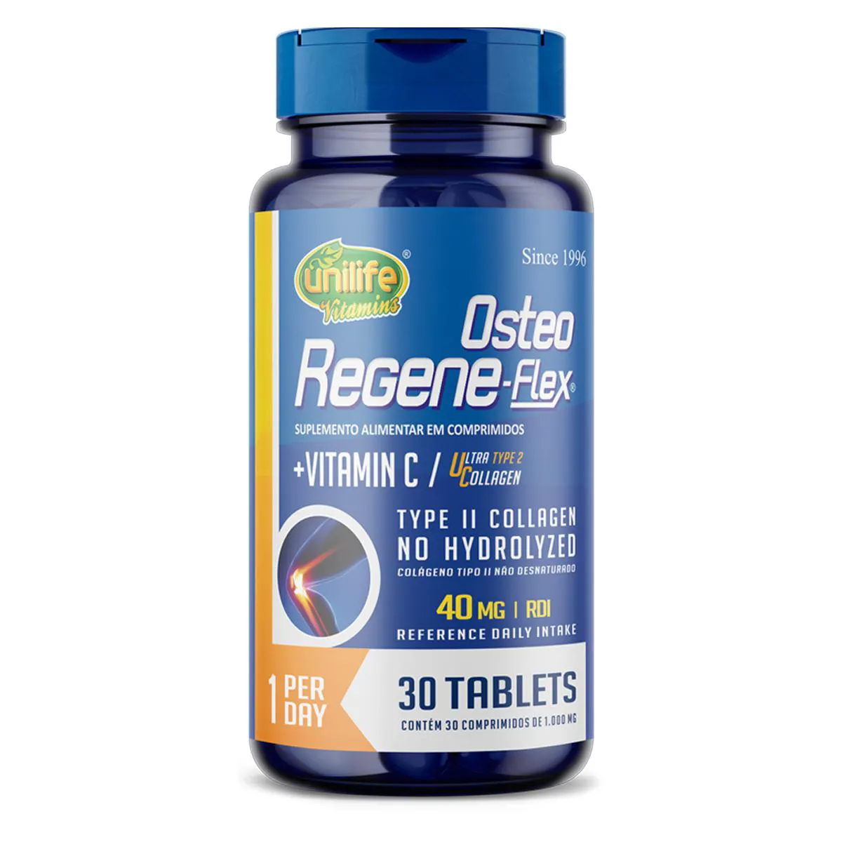 colágeno tipo 2 II 40mg Regeneflex Osteo Unilife O Colágeno Tipo 2 II 40mg Regeneflex Osteo da Unilife é um suplemento que combina dois tipos de colágeno, cada um com suas características e funções: Colágeno Hidrolisado: Derivado principalmente de fontes bovinas, este tipo de colágeno passa por um processo de hidrólise, que o reduz em partículas menores para facilitar sua absorção pelo organismo. Ele é rico em aminoácidos que contribuem para a manutenção de tecidos como pele, unhas, cabelos e estrutura geral do corpo. Colágeno Tipo II Não HidrolisadoExtraído da cartilagem de frango, este colágeno mantém sua estrutura original e é composto por proteínas específicas que estão diretamente relacionadas aos tecidos conectivos, como os encontrados nas articulações. Livre de lactose