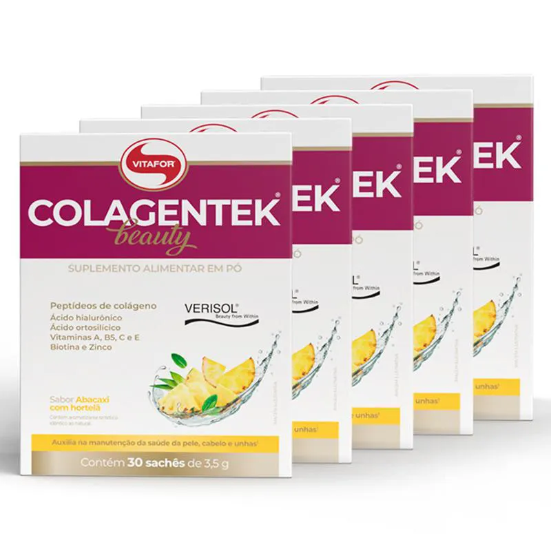 Kit 5 Colagentek Beauty Vitafor 30 Sachês Abacaxi Com Hortelã COLAGENTEK BEAUTY é um suplemento alimentar à base de Peptídeo de colágeno (VERISOL), ácido hialurônico, ácido ortosilícico, vitaminas A, B5, C, E, biotina e zinco. Diferenciais: - 2,5 g de peptídeos de colágeno VERISOL® por porção.