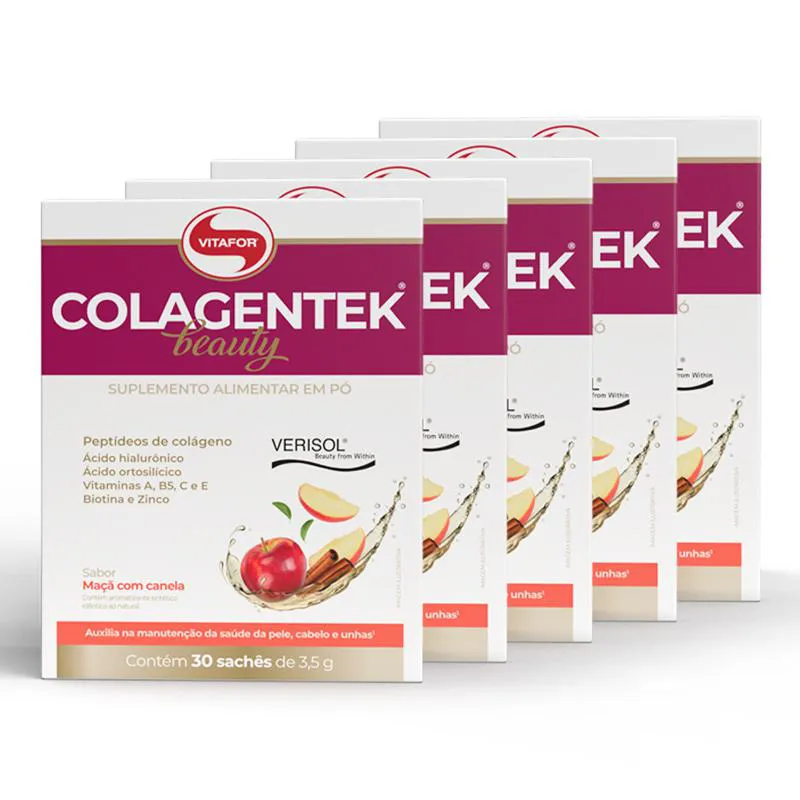 Kit 5 Colagentek Beauty Vitafor 30 Sachês Maçã Com Canela COLAGENTEK BEAUTY é um suplemento alimentar à base de Peptídeo de colágeno (VERISOL), ácido hialurônico, ácido ortosilícico, vitaminas A, B5, C, E, biotina e zinco. Diferenciais: - 2,5 g de peptídeos de colágeno VERISOL® por porção.
