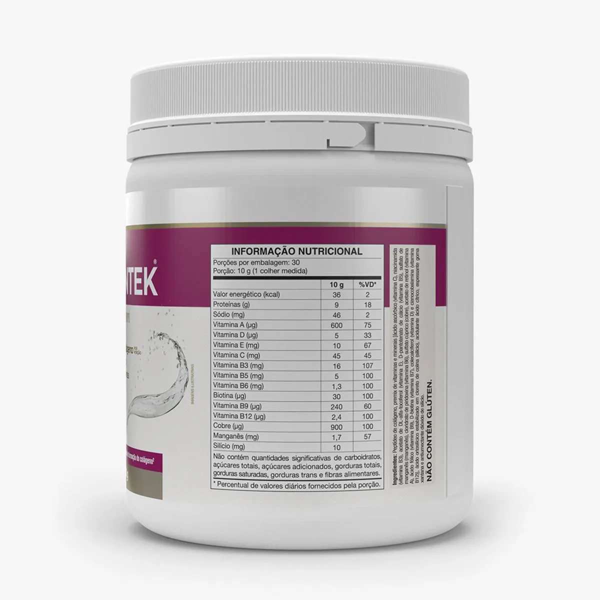 Sabor Neutro: Peptídeo de colágeno, premix de vitaminas e minerais [ácido ascórbico (vitamina c), nicotinamida (vitamina B3), acetato de Dl-alfa-tocoferol (vitamina e), D-pantotenato de cálcio (vitamina B5), sulfato de manganês (manganês), cloridrato de piridoxina (vitamina B6), sulfato cúprico (cobre), acetato de retinol (vitamina a), ácido fólico (vitamina B9), D-biotina (vitamina H), colecalciferol (vitamina d) e cianocobalamina (vitamina B12)], ácido ortosilícico estabilizado em cloreto de colina (silício), acidulante ácido cítrico, espessante goma xantana e antiumectante dióxido de silício. NÃO CONTÉM GLÚTEN.