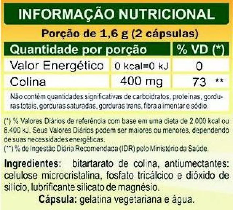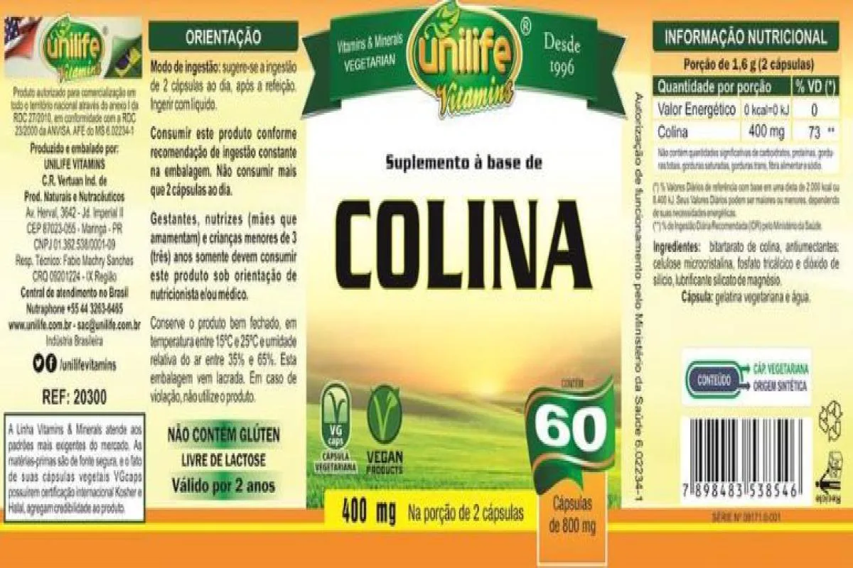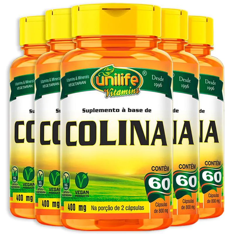 KIT 5 COLINA VITAMINA B8 UNILIFE 60 CÁPSULAS Colina é um precursor da acetilcolina. Participa do metabolismos dos lipídios e atua como fonte de grupos metilos em outros processos metabólicos.