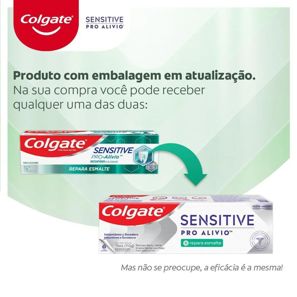 Esse creme dental para sensibilidade Colgate Sensitive Pro Alívio Repara Esmalte tem fórmula exclusiva Pro-Argin, que proporciona alívio instantâneo à dor da sensibilidade enquanto remineraliza o esmalte e faz seus dentes ficarem mais resistentes.
