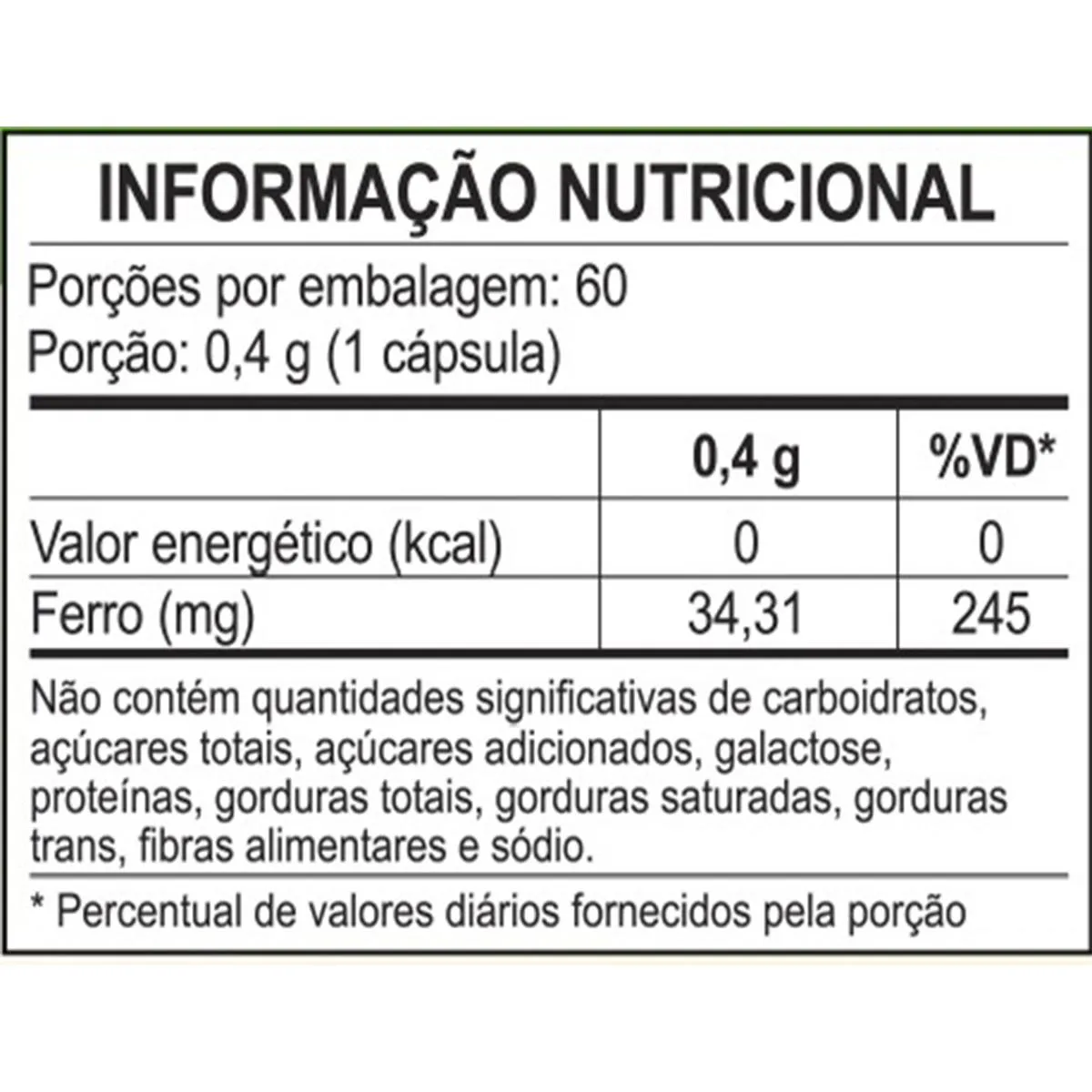 - desenvolvimento correto de inúmeras funções fisiológicas. Informações complementares O sangue é o alimento que mais contém ferro. os cereais integrais são bastante ricos, mas o refino e a peneiração abaixam consideravelmente o teor de ferro. as quantidades ingeridas são geralmente insuficientes. as gorduras são pobres em ferro. por isso é importante a ingestão de ferro em  suplemento, sem esquecer que certas anemias por falta de ferro podem ter sua causa na carência de cobre, que será necessário ser reajustado para melhorar a quantidade de hemoglobina.  Ingredientes Bisglicinato ferroso, excipiente q.s.p 500 mg, cápsula gelatina vegetariana e água. não contém glúten. Modo de uso Ingerir 1 cápsula ao dia após a refeição.