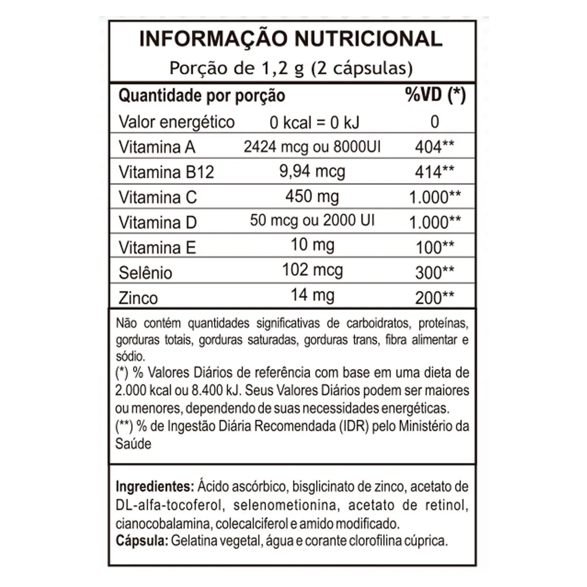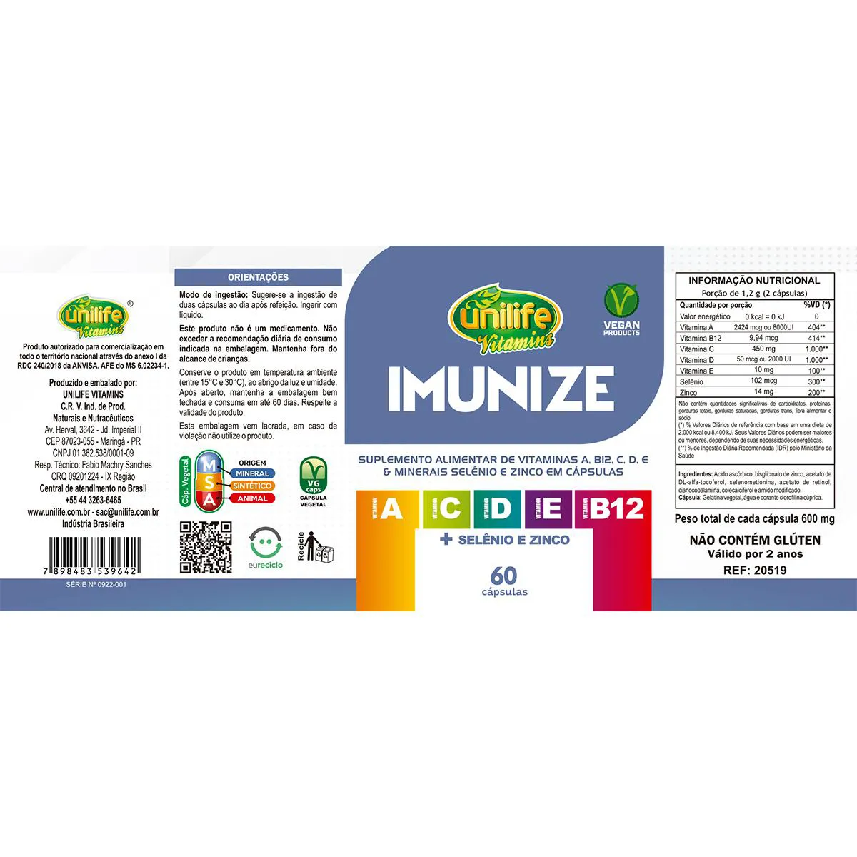 Kit 5 Imunize Vitaminas A, C, D, E, B12 + Selênio e zinco Unilife 60 cápsulas Desenvolvido a Selênio, zinco e vitaminas essenciais, o produto é livre de glúten  e está disponível na versão: 60 cápsulas. Você o encontra nas melhores lojas de produtos naturais/farmácias ou e-commerces (lojas Virtuais). MODO DE INGESTÃO: Sugere-se a ingestão de 2 cápsulas ao dia, após a refeição. Ingerir com líquido. PESO TOTAL DA CÁPSULA: 600 mg Cápsula: Gelatina vegetariana, água e corante clorofilina cúprica.