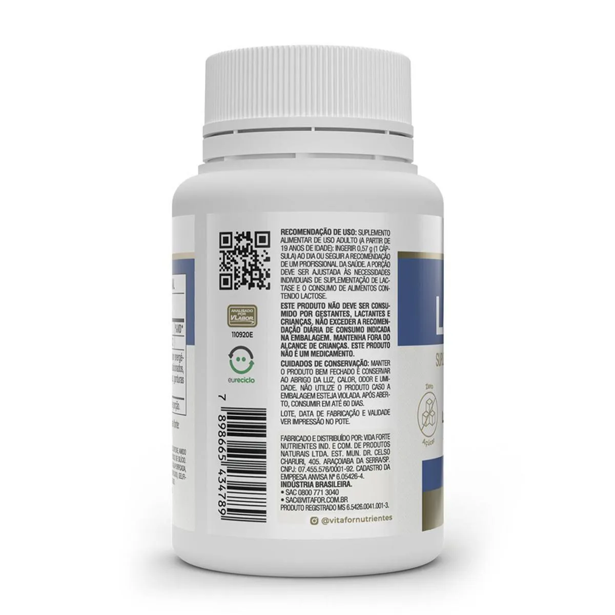 - Selo de Qualidade VLabor. Recomendações de Uso: - Suplemento alimentar de uso adulto (a partir de 19 anos de idade): ingerir 1 cápsula ao dia ou seguir a recomendação de um profissional da saúde. A porção deve ser ajustada às necessidades individuais de suplementação de lactase e o consumo de alimentos contendo lactose. Cuidados e Conservação: - Manter o produto bem fechado e conservar ao abrigo da luz, calor, odor e umidade.