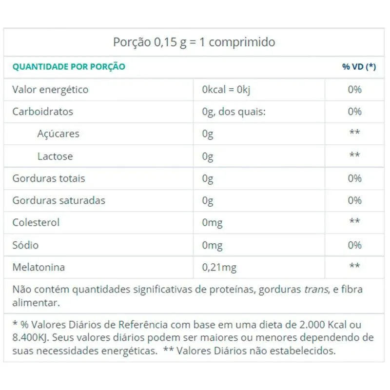 MARACUJÁ: Melatonina; Edulcorantes: Manitol (INS 421) e Sucralose (INS 955), Agente de massa: Celulose microcristalina (INS 460i); Estabilizante: Croscarmelose sódica (INS 468); Aromatizante: Aroma idêntico ao natural de maracujá; Antiumectantes: Dióxido de silício (INS 551) e Estearato de magnésio (INS 470iii).Categoria de alimento dispensado de registro conforme Resolução RDC 27/2010.Consulte as advertências e a recomendação de uso constante no rótulo do produto. Imagens meramente ilustrativas. Material destinado ao uso exclusivo por profissionais da área de saúde. Contém aromatizante sintético idêntico ao natural.