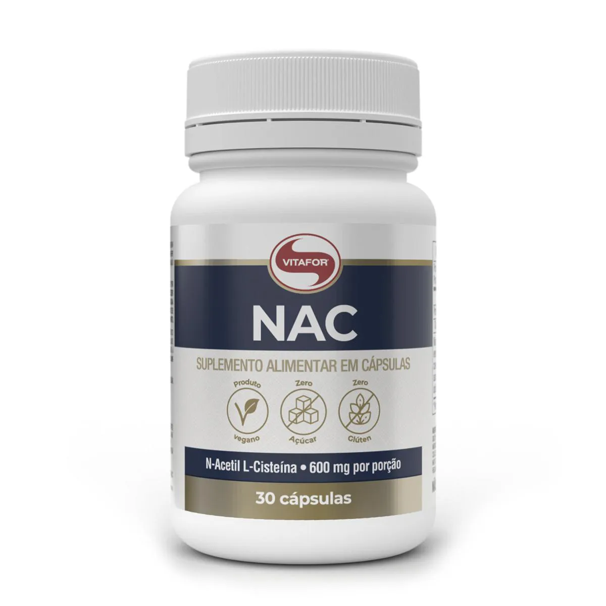 Kit 5 NAC N-Acetil L-Cisteína 600mg Vitafor 30 Cápsulas NAC é um suplemento alimentar composto pelo aminoácido N-acetil L-cisteína (NAC) com concentração de 600mg por cápsula. Diferenciais: - Zero glúten e açúcar.