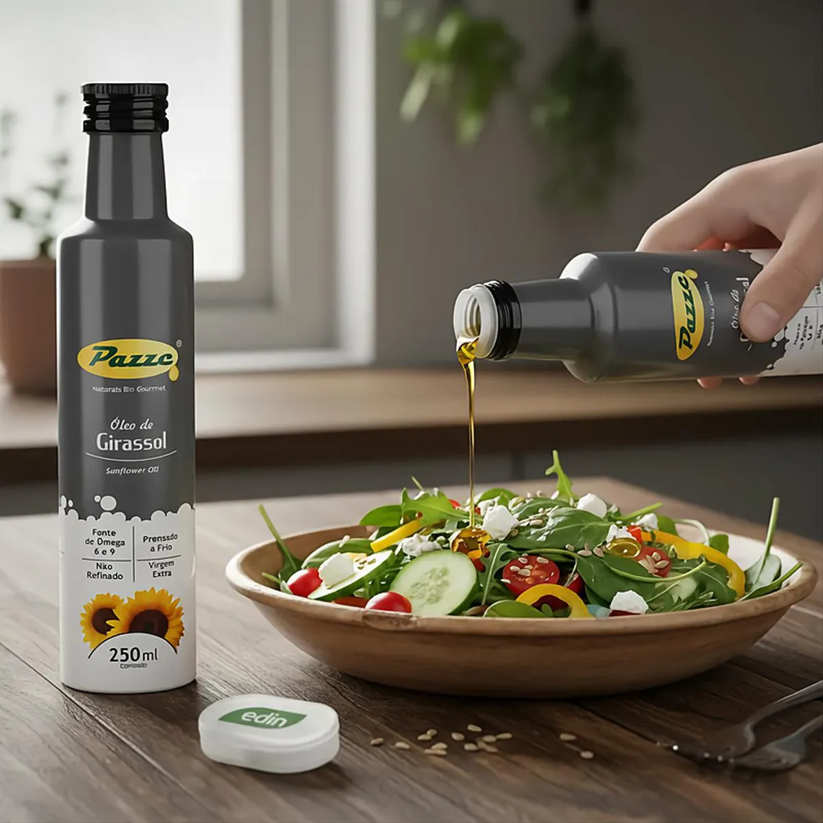Óleo vegetal de girassol obtido por prensagem a frio, engarrafado e lacrado, próprio para uso culinário. Possui sabor leve e neutro, podendo ser utilizado em preparações frias.