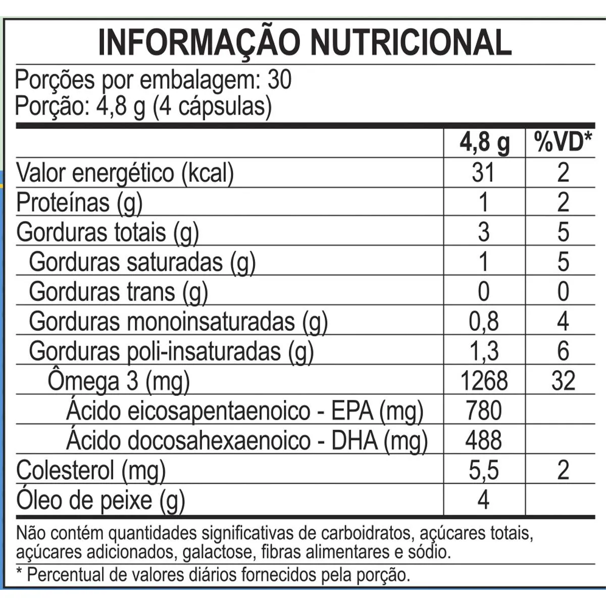 Porção de 2 cápsulas (2,4 g) fornece 720 mg de EPA e 480 mg de DHA. Alergênicos: