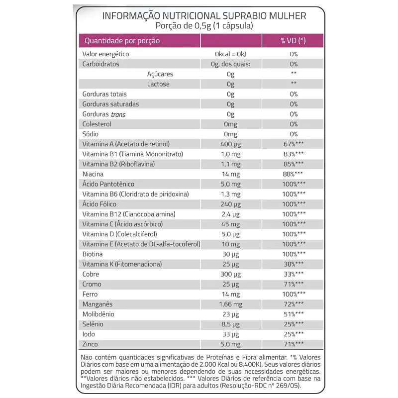 Óxido de magnésio, Pirofosfato de ferro, vitamina c, Acetato de vitamina e, Nicotinamida, Sulfato de manganês mono-hidratado, Óxido de zinco, Pantotenato de cálcio, Acetato de retinol, Fitomenadiona, Vitamina B12, Colecalciferol, Biotina, Cloridrato de piridoxina, Riboflavina, Mononitrato de Tiamina, Sulfato de cobre anidro, Molibdato de sódio di-hidratado, Iodeto de potássio, Ácido fólico, Picolinato de cromo e Selenito de sódio. Antiumectante: Celulose Microcristalina (INS 460i) e Dióxido de silício (INS 551). Lubrificante: Estearato de magnésio (INS 471iii). Gelificante: gelatina (INS 428). Acidulante: Ácido acético (INS 260). Corantes: Dióxido de titânio (INS 171), Eritrosina (INS 127), Amaranto (INS 123) e Azul brilhante (INS 133). Ingestão Recomendada: