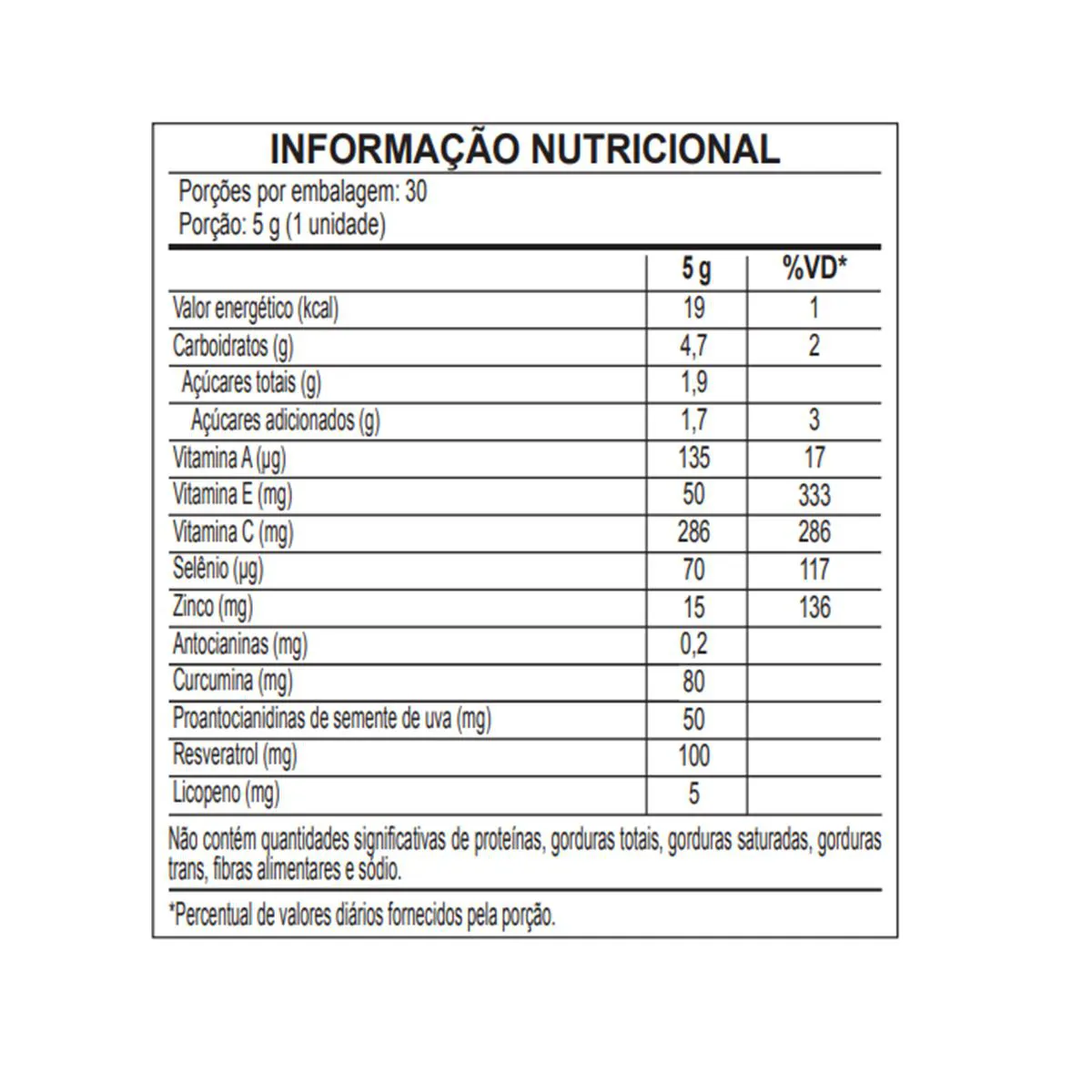 minerais e os principais polifenóis. APRESENTAÇÃO: Embalagem disponível: Caixa com 30 sticks de 5 g cada. Peso Líquido: 150 g Contém: 30 unidades. Produto classificado como: SUPLEMENTO ALIMENTAR EM PÓ SABOR DE FRUTAS VERMELHAS. SUGESTÃO DE CONSUMO: Diluir 5 g (1 sachê) em 200 ml de água de preferência gelada. Consumir uma vez ao dia ou conforme orientação profissional. CONSERVAÇÃO: Conservar este produto ao abrigo de luz, calor e umidade. Após aberta a unidade o seu consumo deve ser imediato. Este produto pode sofrer alterações como empedramento e realce da pigmentação, sem risco ao consumo ou perda de sua eficiência. INGREDIENTES: Polpa de frutas vermelhas, ácido ascórbico, mix de vitaminas (palmitato de retinila, L-selenometionina e antiumectante dióxido de silício), acetato de DL-alfa-tocoferol, transresveratrol de levedura (Saccharomyces cerevisiae), concentrado de rabanete e cenoura, extrato de rizomas de cúrcuma (Curcuma longa L.), extrato seco de semente de uva (Vitis vinifera L.), bisglicinato de zinco, licopeno sintético, extrato de laranja moro (Citrus sinensis (L.) Osbeck), aromatizantes naturais, antiumectante fosfato tricálcico e edulcorante glicosídeos de esteviol de Stevia rebaudiana Bertoni. NÃO CONTÉM GLÚTEN. ESTE PRODUTO NÃO É UM MEDICAMENTO. NÃO EXCEDER A RECOMENDAÇÃO DIÁRIA DE CONSUMO INDICADA NA EMBALAGEM. MANTENHA FORA DO ALCANCE DE CRIANÇAS. ESTE PRODUTO É RECOMENDADO PARA ADULTOS A PARTIR DE 19 ANOS Registro: RDC nº 240/2018 ANVISA