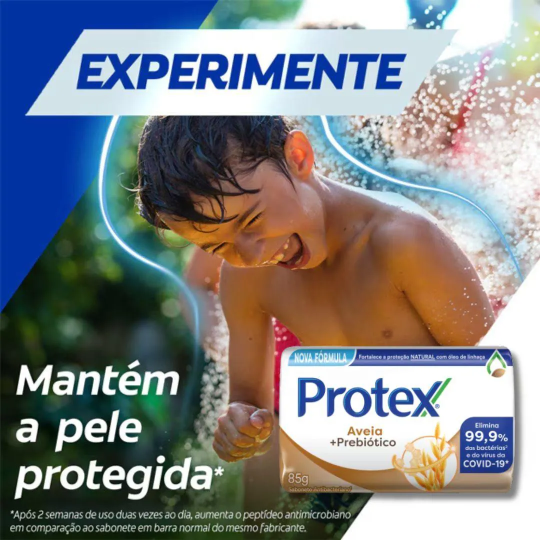 Kit com 5 sabonetes Protex Aveia + Prebiótico 85g A Protex reinventou os sabonetes antibacterianos, sua fórmula fortalece a proteção natural com óleo de linhaça. Ela é enriquecida com aveia + prebiótico, limpa suavemente e remove as impurezas para a obtenção de uma pele suave, protegida e saudável. Elimina 99,9% das bactérias* e o vírus da COVID-19! Ingredientes ativos: - Oleato de Sódio Palmitato de Sódio Laurato de Sódio (sabonete de sódio), Aqua Áqua, Glicerol, Caulim, Perfume, Farinha da Semente de Avena Sativa, Óleo da Semente de Linum Usitatissimum, Cloreto de Sódio, Dióxido de Titânio, Edetato de Sódio, Ácido Etidrônico, Inulina, CI 47005 Amarelo de Quinolina Laca de Alumínio, CI 14700 Vermelho Escarlate 125, CI 61570 Corante Verde 61570, Salicilato de Benzila, Linalol, Citronelol, Cumarina, Geraniol Como usar? - Molhe o corpo ou a área desejada, ensaboe normalmente e enxague. Precauções: - Mantenha fora do alcance de crianças. Evite contato com os olhos, se isso acontecer, enxague com bastante água. Se você perceber qualquer reação desfavorável, pare de usar e consulte o seu médico. Este produto pode ser irritante se não for usado como informado nas instruções de uso. Marca: Protex Linha: Aveia + Prebiótico Tipo: Sabonete em barra Peso unitário: 85g Quantidade no kit: 5 unidades Ação: Elimina até 99,9% das bactérias Proteção: Até 12 horas Fórmula: Com óleo de linhaça, aveia e prebiótico Indicação: Corpo pH: Balanceado Dermatologicamente testado: Sim Textura: Espuma cremosa