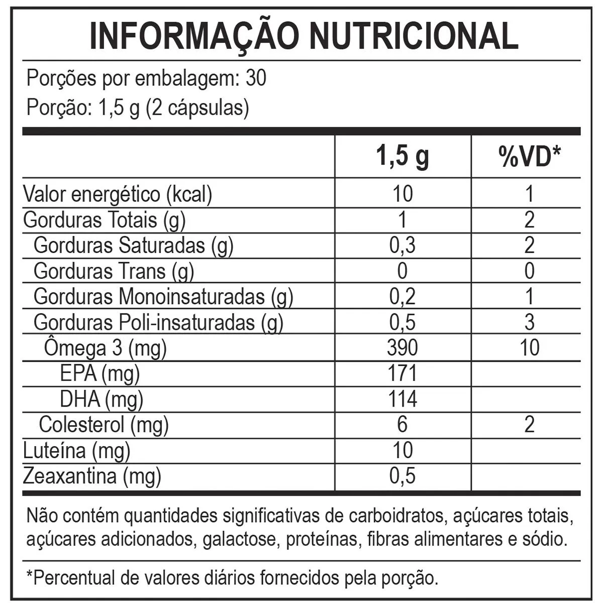 Óleo de peixe, luteína da flor de Tagetes erecta, água purificada, óleo de cártamo, gelificante gelatina, umectante glicerol, corantes óxido de ferro vermelho, dióxido de titânio e vermelho ponceau e antioxidantes mistura concentrada de tocoferóis e DL-alfatocoferol.