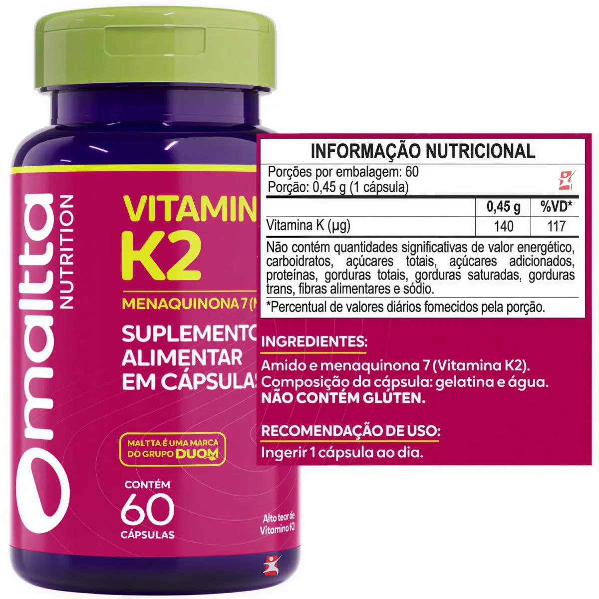 COMBO COM 5 VITAMINA K2 MENAQUINONA 7 MK-7 1 CÁPSULA POR DIA 60 CÁPSULAS - TOTAL: 300 CÁPSULAS – DUOM _x000D_ _x000D_ — descrição — INDÚSTRIA DO CORPO _x000D_ Vitamina K2 conhecida como menaquinona -7, é um suplemento alimentar essencial para a formação e reparo dos ossos, realiza a síntese da osteocalcina que é uma proteína no tecido ósseo utilizada para cristalização do cálcio, inibe a calcificação dos vasos sanguíneos, removendo os depósitos onde não são necessários. A vitamina K2 auxilia na ação anti-inflamatória das articulações. _x000D_ _x000D_ — benefícios — INDÚSTRIA DO CORPO _x000D_ - 1 Cápsula fornece 215% da IDR (ingestão diária recomendada); _x000D_ Além da distribuição do cálcio para o lugar certo (ossos), a vitamina k2 proporciona os seguintes benefícios para o organismo: _x000D_ - Artérias mais flexíveis, diminuindo a pressão arterial; _x000D_ - Dentes mais fortes; _x000D_ - Ossos mais fortes; _x000D_ - Auxilia a limpar as válvulas cardíacas, tirando o cálcio em excesso; _x000D_ - Auxilia a limpar o músculo cardíaco, para o coração bater com mais tranquilidade; _x000D_ - Auxilia a evitar arritmia cardíaca; _x000D_ - Desinflama as articulações; _x000D_ - Tira o excesso de cálcio dos rins, evitando as pedras de rins; _x000D_ - Tira o excesso de cálcio da pele, evitando o envelhecimento; _x000D_ - Tira o excesso de cálcio do cérebro, aliviando o órgão sobrecarregado. _x000D_ _x000D_ — sugestão de uso — INDÚSTRIA DO CORPO _x000D_ Tomar 1 cápsula ao dia. _x000D_ _x000D_ — tabela nutricional — INDÚSTRIA DO CORPO _x000D_ EM ANEXO NAS IMAGENS. _x000D_ _x000D_ — composição — INDÚSTRIA DO CORPO _x000D_ EM ANEXO NAS IMAGENS. _x000D_ _x000D_ — recomendações — INDÚSTRIA DO CORPO _x000D_ EM ANEXO NAS IMAGENS. _x000D_ _x000D_ — dados técnicos — INDÚSTRIA DO CORPO _x000D_ Marca – Duom. _x000D_ Conteúdo líquido por frasco – 60 cápsulas. _x000D_ Conteúdo líquido total – 300 cápsulas. _x000D_ Rendimento por frasco – 60 porções/doses. _x000D_ Rendimento total – 300 porções/doses. _x000D_ Peso líquido por frasco – 27g. _x000D_ Peso líquido total – 135g. _x000D_ Peso aproximado produto + embalagem - 350g. _x000D_ Código de barras (EAN) – 7898665750285. _x000D_ Registro ANVISA – Dispensado de registro de acordo com a resolução da RDC 27/2010 e RDC 240/2018 da ANVISA. _x000D_ Dimensões do produto – largura: 6 cm; altura: 10 cm; comprimento: 6 cm. _x000D_ Dimensões da embalagem/pacote - largura: 12 cm; altura: 10 cm; comprimento: 16 cm. _x000D_ _x000D_ — itens do anúncio — INDÚSTRIA DO CORPO _x000D_ 1 Unidades do produto: COMBO COM 5 VITAMINA K2 MENAQUINONA 7 MK-7 1 CÁPSULA POR DIA 60 CÁPSULAS CADA – DUOM. _x000D_ Total – 300 Cápsulas.