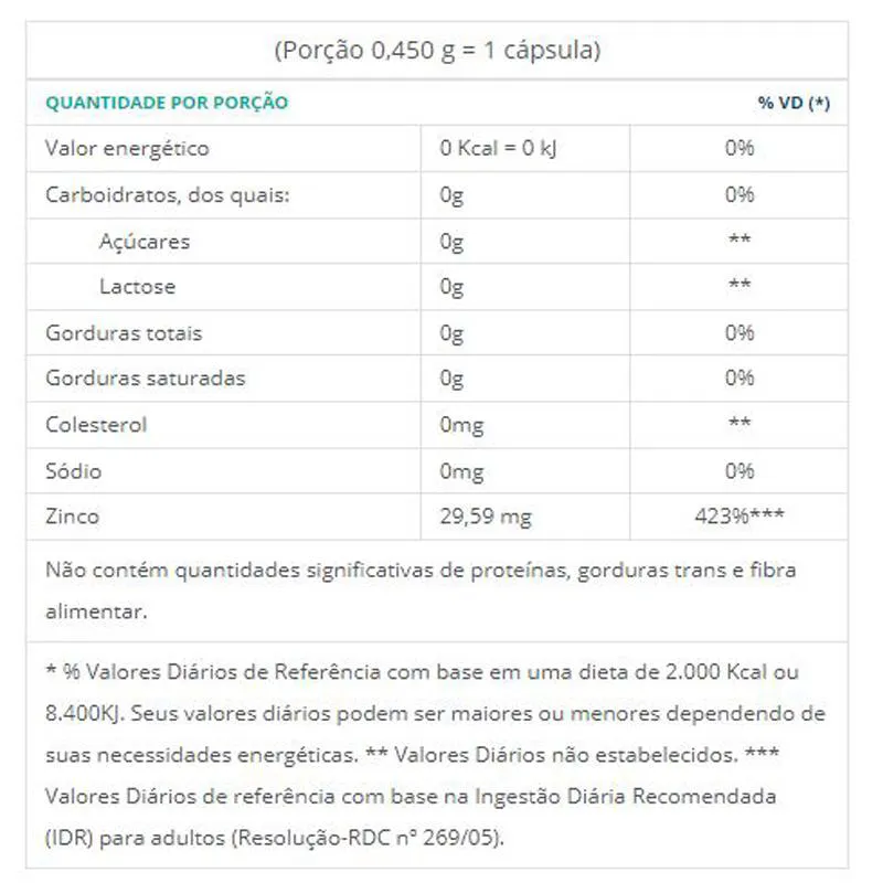 Cada cápsula contém: Bisglicinato de Zinco 20% Quelato. Agente de massa: Celulose Microcristalina (INS 460i), Antiumectantes: Dióxido de Silício (INS 551) e Estearato de magnésio (INS 470iii). Gelificante: gelatina (INS 428), e Corantes: Amarelo Crepúsculo (INS 110), Dióxido de titânio (INS 171), Azul Brilhante (INS 133), Amarelo de Quinoleína (INS 104), Azorrubina (INS 122). NÃO CONTÉM GLÚTEN.