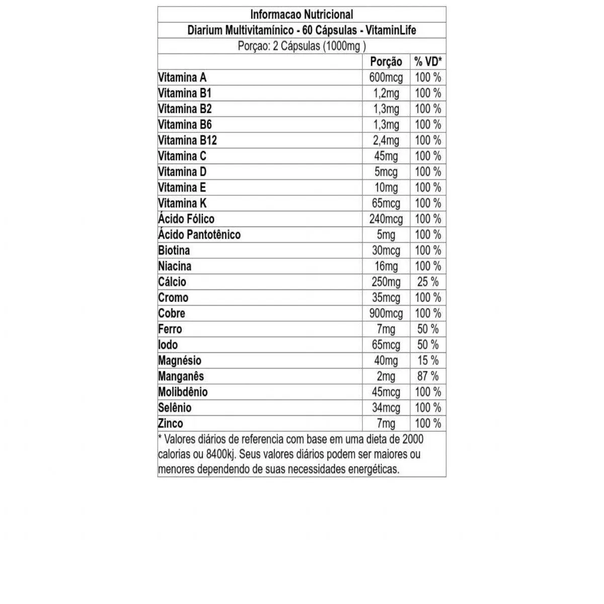 Ingredientes - Diarium Multivitamínico - 60 Cápsulas - VitaminLife
