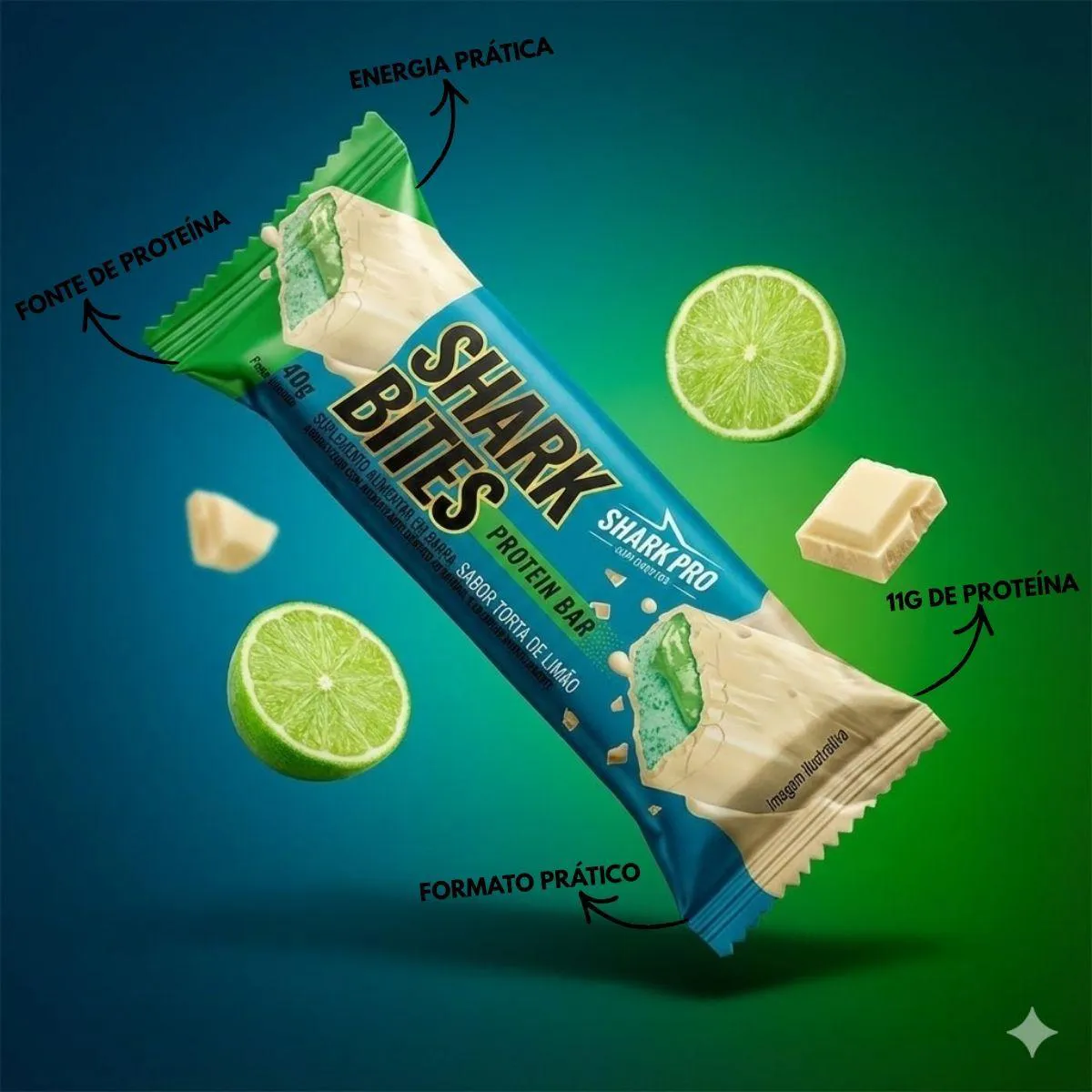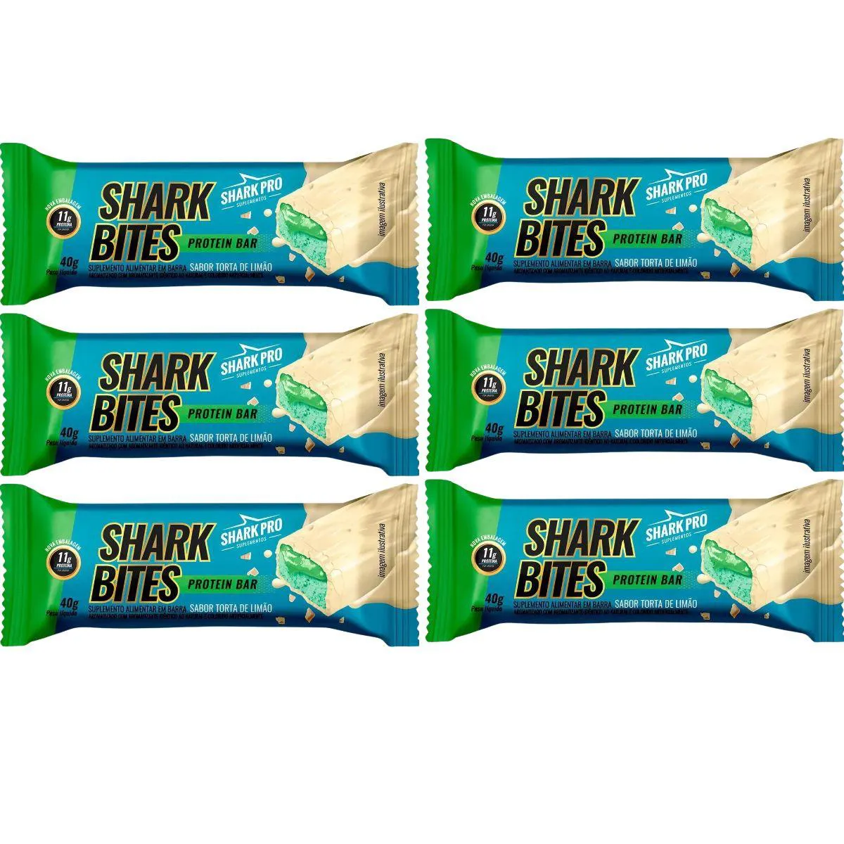 O produto é um kit composto por 6 barras proteicas individuais de 40g cada, com sabor de torta de limão, desenvolvido pela marca Shark Pro. Cada barra contém 11g de proteína, apresentada em embalagem prática e de fácil transporte.