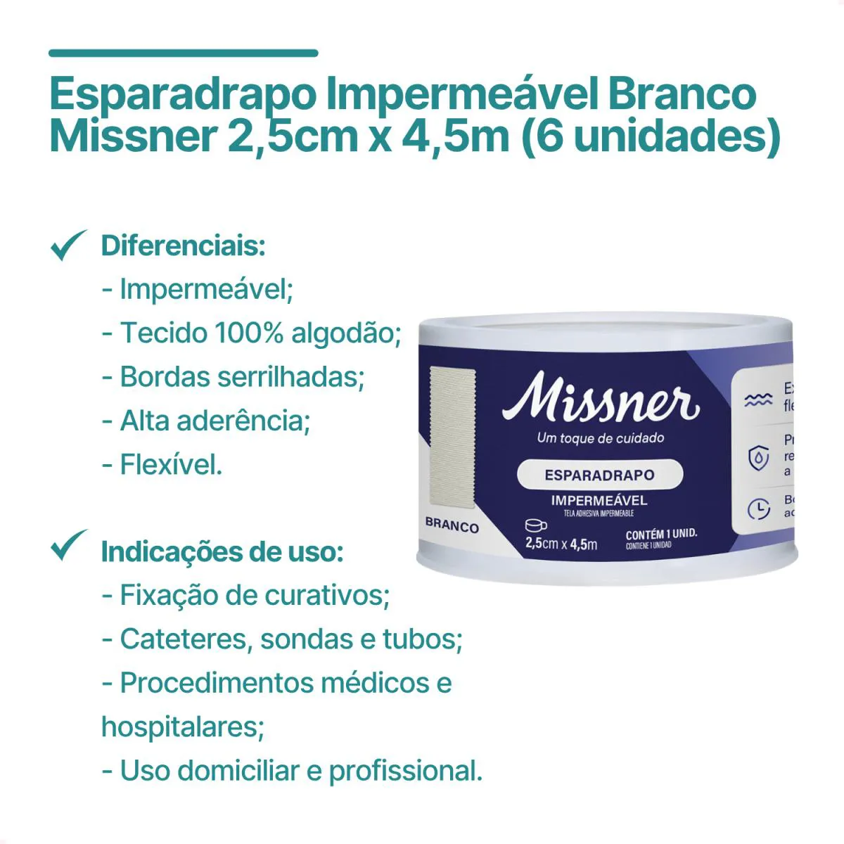 O Esparadrapo Impermeável Branco da Missner é ideal para fixação de curativos, cateteres, sondas e outros dispositivos médicos. Fabricado com tecido 100% algodão e uma camada impermeabilizante na parte superior, impede a entrada de água e agentes contaminantes, protegendo o local do ferimento com segurança e conforto.