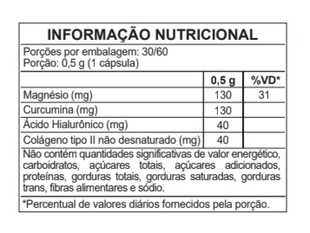 ·         Suplemento alimentar com fórmula composta por colágeno tipo II não desnaturado, ácido hialurônico, magnésio bisglicinato e cúrcuma. ·         O colágeno tipo II é uma proteína presente na cartilagem, responsável por sua firmeza e resistência. ·         A cúrcuma possui propriedades antioxidantes, e sua associação com os demais ingredientes oferece suporte nutricional às articulações. ·         O magnésio bisglicinato contribui para a manutenção da função muscular e metabolismo energético.