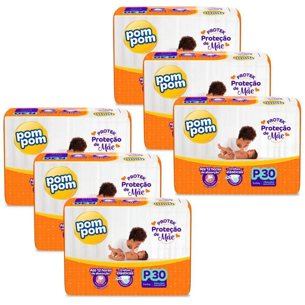 Kit Contém: 6 Pacotes de fraldas Pom Pom Protek Proteção de Mãe Jumbo P com 30un cada