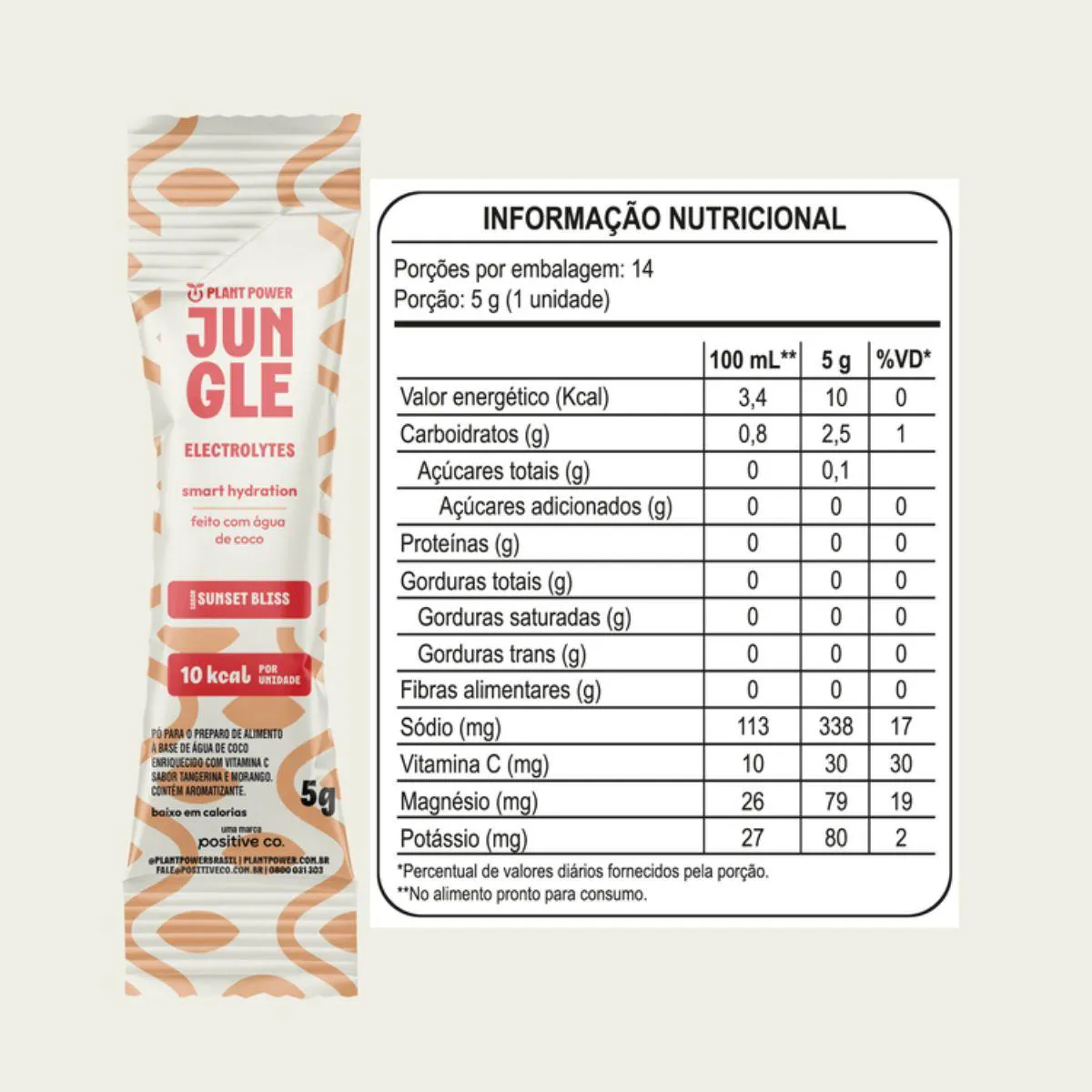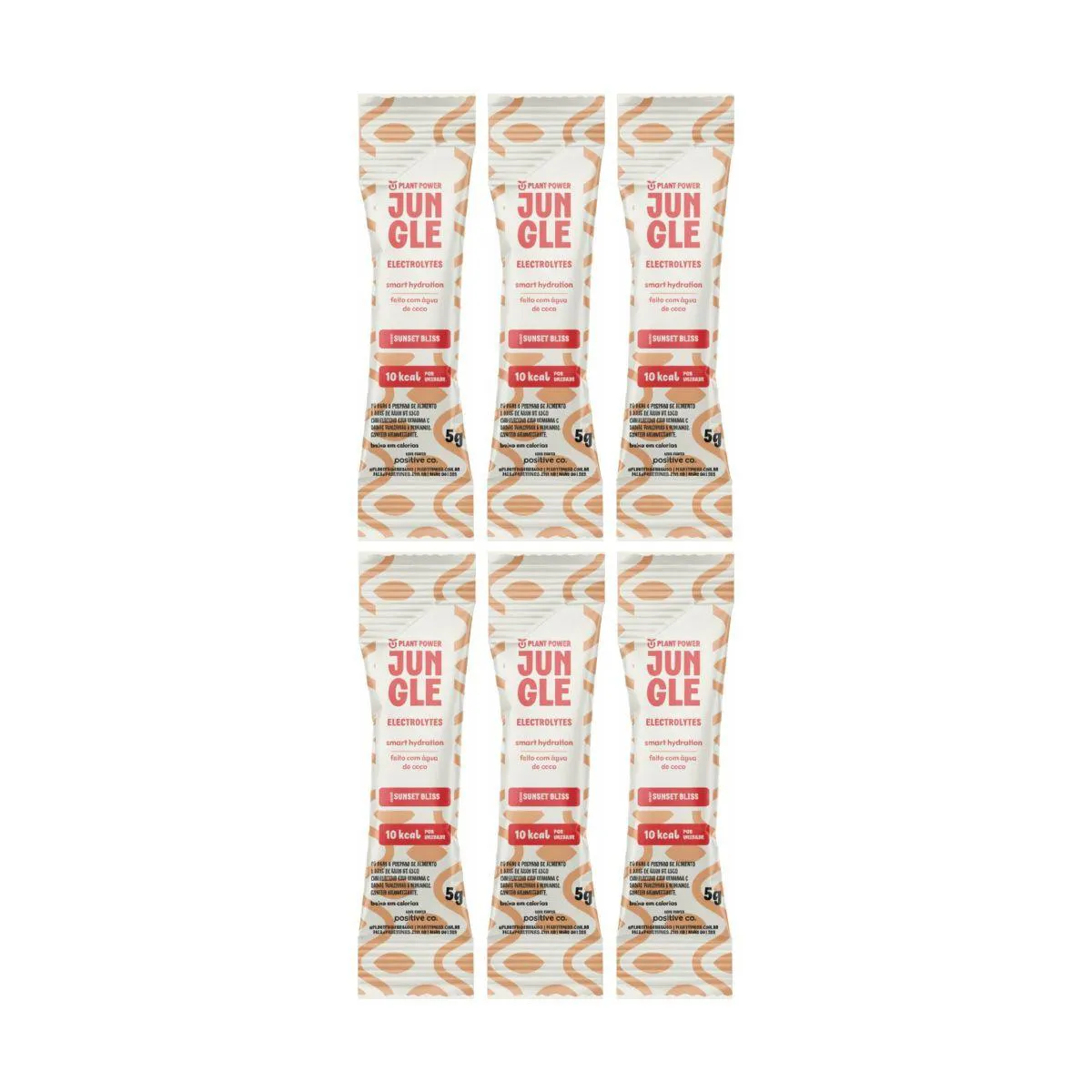 KIT 6 JUNGLE SUNSET BLISS 5G PLANT POWER O Jungle Sunset Bliss 5g Plant Power é a escolha ideal para manter a hidratação e o equilíbrio do corpo em qualquer momento do dia. Com sabor leve e refrescante de tangerina com morango, faz parte da linha Low Carb da Jungle Electrolytes e foi desenvolvido para oferecer uma reposição eficiente de sais minerais e vitaminas, com baixas calorias e fórmula limpa. Cada sachê de 5g, quando diluído em 300ml de água, fornece 30mg de vitamina c, 79mg de magnésio, 80mg de potássio e 338mg de sódio — uma combinação perfeita para repor eletrólitos de forma natural e ajudar na hidratação após treinos, calor intenso ou rotina ativa. Com apenas 10 calorias por porção, o Jungle Sunset Bliss é livre de açúcar, corantes, conservantes e aditivos artificiais, garantindo uma bebida leve, equilibrada e funcional. Diferenciais do Produto Linha Low Carb com sabor tangerina e morango 30mg de vitamina C por porção Reposição de eletrólitos com magnésio, potássio e sódio Apenas 10 calorias por sachê Zero açúcar, sem conservantes e corantes artificiais Fórmula limpa e natural Modo de preparo Diluir 1 sachê de 5g em 300ml de água e mexer até completa dissolução. Consumir logo após o preparo. Ideal para Reposição eletrolítica durante treinos, atividades ao ar livre ou em dias quentes Hidratação funcional com leve sabor frutado Rotinas de bem-estar e alimentação equilibrada
