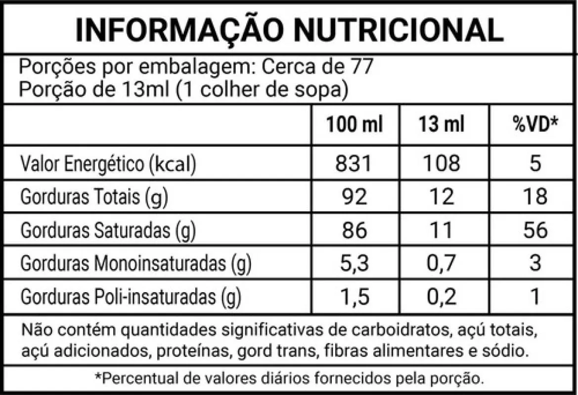 O Óleo de Coco Extravirgem da Santo Óleo é obtido por prensagem a frio da película do coco, aquela parte marrom que fica grudada na polpa branca. Esse processo preserva as propriedades naturais do óleo, resultando em um produto de alta qualidade com acidez máxima de 0,3%. Composição: Ingrediente Único: Óleo de coco (Cocos Nucifera L)NÃO CONTÉM GLÚTEN Recomendação de Uso: Ideal para uso culinário, o Óleo de Coco Extravirgem pode substituir outros óleos em preparações diversas, como frituras, assados e refogados. Também é indicado para uso estético, podendo ser aplicado diretamente na pele e nos cabelos como hidratante natural. Advertências: