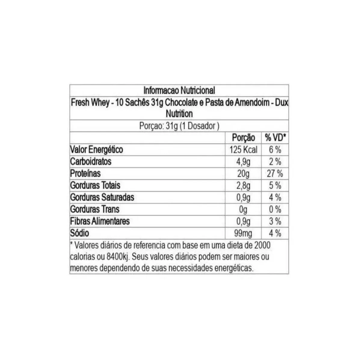 KIT 6 SACHE WHEY PROTEIN FRESH CHOCOLATE AMENDOIM DUX 3W ALTA ABSORÇÃO FORÇA FRESH WHEY DUX é uma categoria única de suplementos PROTEICOS com sabores REAIS e surpreendentes. Sua fórmula é rigorosamente pura e limpa, feita com cacau e pasta de AMENDOIM de verdade para sua ALTA PERFORMACE. Ideal para quem busca máxima FORÇA, ALTA ABSORÇÃO e o melhor em suplementação. WHEY 3W: QUALIDADE E RECUPERAÇÃO MÁXIMA O DUX Fresh Whey é um SUPLEMENTO selecionado de proteína 3W, a combinação mais eficiente e COMPLETA: WHEY CONCENTRADA: Garante o sabor delicioso e a cremosidade. WHEY ISOLADA: Promove a máxima pureza proteica. WHEY HIDROLISADA: Oferece a mais rápida e ALTA ABSORÇÃO para o seu MUSCULO. Este blend especial garante 20G de PROTEINA por dose e alto teor de BCAA's, sendo a matéria-prima essencial para RECUPERAÇÃO e o crescimento muscular. POR QUE ESCOLHER FRESH WHEY CHOCOLATE E PASTA DE AMENDOIM? O sabor é um blend especial de CHOCOLATE e PASTA DE AMENDOIM, feito com ingredientes naturais. É uma alternativa versátil para suplementação de PROTEINA, podendo ser utilizada em qualquer momento do dia por quem busca melhorar sua saúde e bem-estar geral. A proteína é o alicerce fundamental de todas as estruturas do corpo, sendo vital para: RECUPERAÇÃO MUSCULAR pós-treino, permitindo que o corpo se reconstrua mais rapidamente. Contribuição para o ganho e manutenção da MASSA MUSCULAR, elevando a FORÇA. Fonte de ENERGIA e saciedade, auxiliando no controle da dieta e na PERFORMACE PARA O TREINO. FÓRMULA CLEAN LABEL E PRATICIDADE Experimente o que há de melhor! Este WHEY IMPORTADO tem um compromisso com a pureza, usando aromas e adoçantes NATURAIS, sem ingredientes inferiores ou artificiais. É a escolha de marca reconhecida pela qualidade para quem ama cuidar do corpo: Sem adição de açúcares; Livre de conservantes, espessantes ou estabilizantes. O SACHÊ (31G) é fácil de preparar e consumir no dia a dia, perfeito para levar na bolsa e garantir sua dose de PROTEINA. SUGESTÕES DE USO Fresh Whey pode ser consumido a qualquer hora do dia: como lanche saudável e saboroso, pré ou pós-treino, ou misturado em preparações doces ou salgadas, quentes ou frias. INFORMAÇÕES TÉCNICAS E ALÉRGENOS Tipo de Produto: WHEY PROTEIN (Proteína de Soro do Leite) Tipo de Whey: 3W (Concentrada, Isolada e Hidrolisada) Conteúdo: 1 SACHÊ (31G) Proteína por Dose: 20G ALÉRGICOS: CONTÉM DERIVADOS DE AMENDOIM, soja E LEITE. PODE CONTER TRIGO, AVEIA, AMÊNDOA, AVELÃS, CASTANHA-DE-CAJU E PISTACHES. CONTÉM LACTOSE. CONTÉM GLÚTEN. ESTOQUE LIMITADO! Garanta o seu Fresh Whey CHOCOLATE AMENDOIM com ALTA ABSORÇÃO agora. Compre e sinta a diferença na sua FORÇA e ENERGIA! Aviso legal Este produto é um SUPLEMENTO dietético, não um medicamento. Suplementa dietas insuficientes. Consulte o seu médico e/ou farmacêutico.